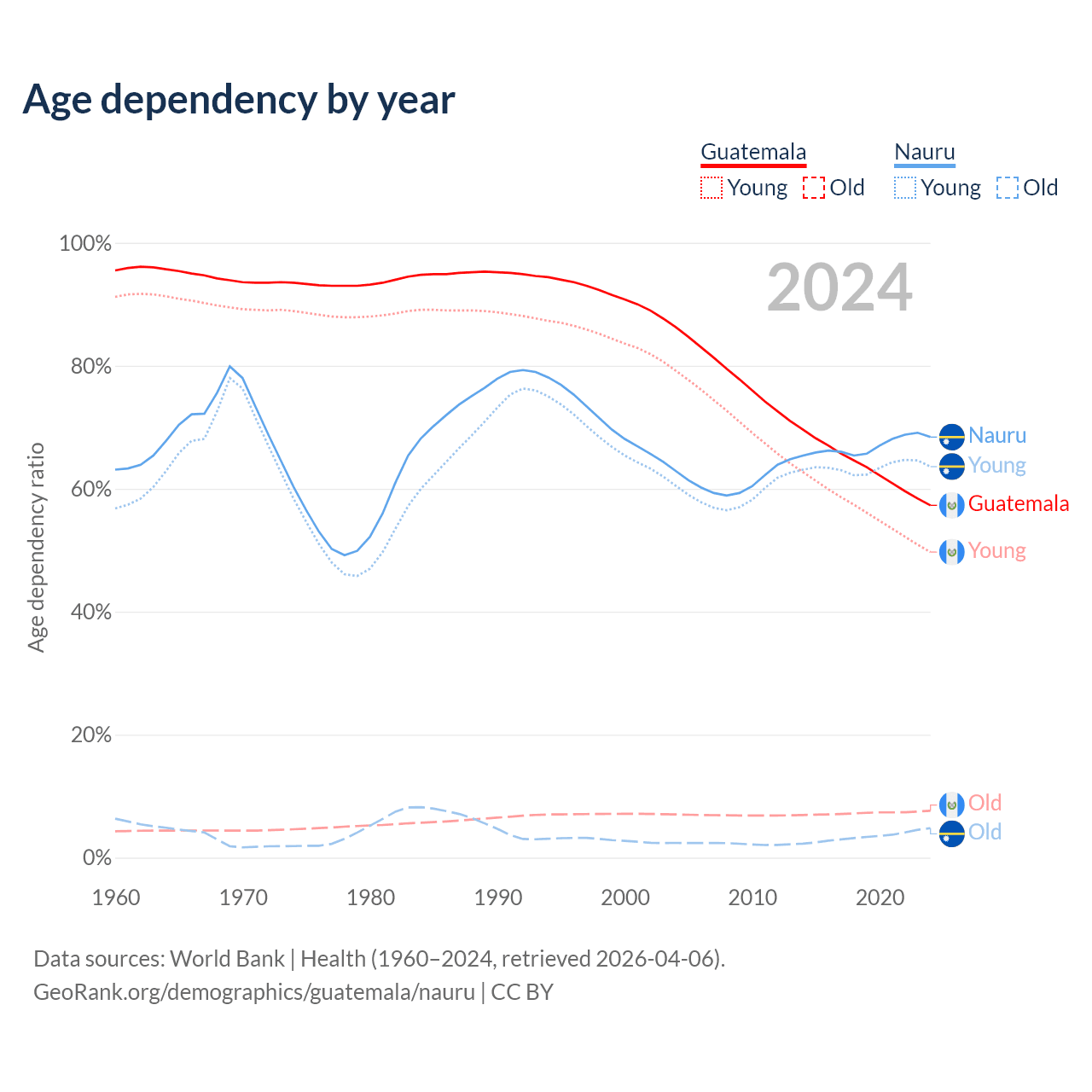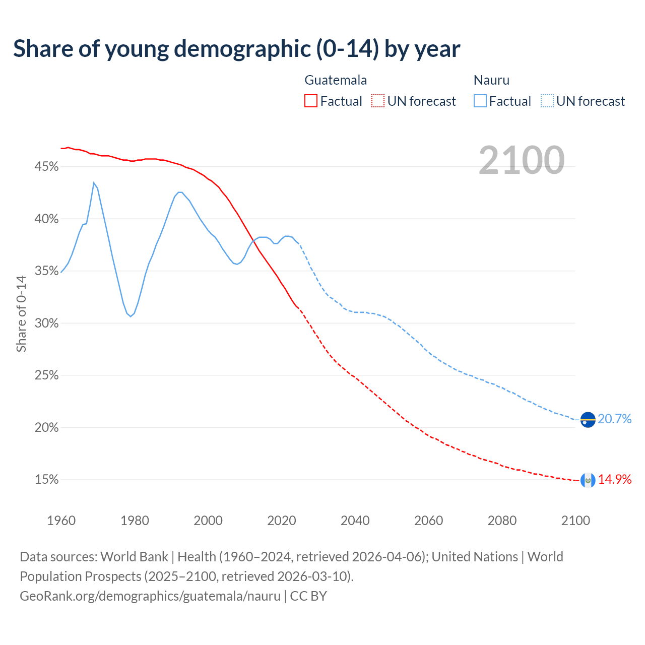 - The share of young demographic (0-15 years old) in Guatemala is 31.6% vs 37.8% in Nauru.