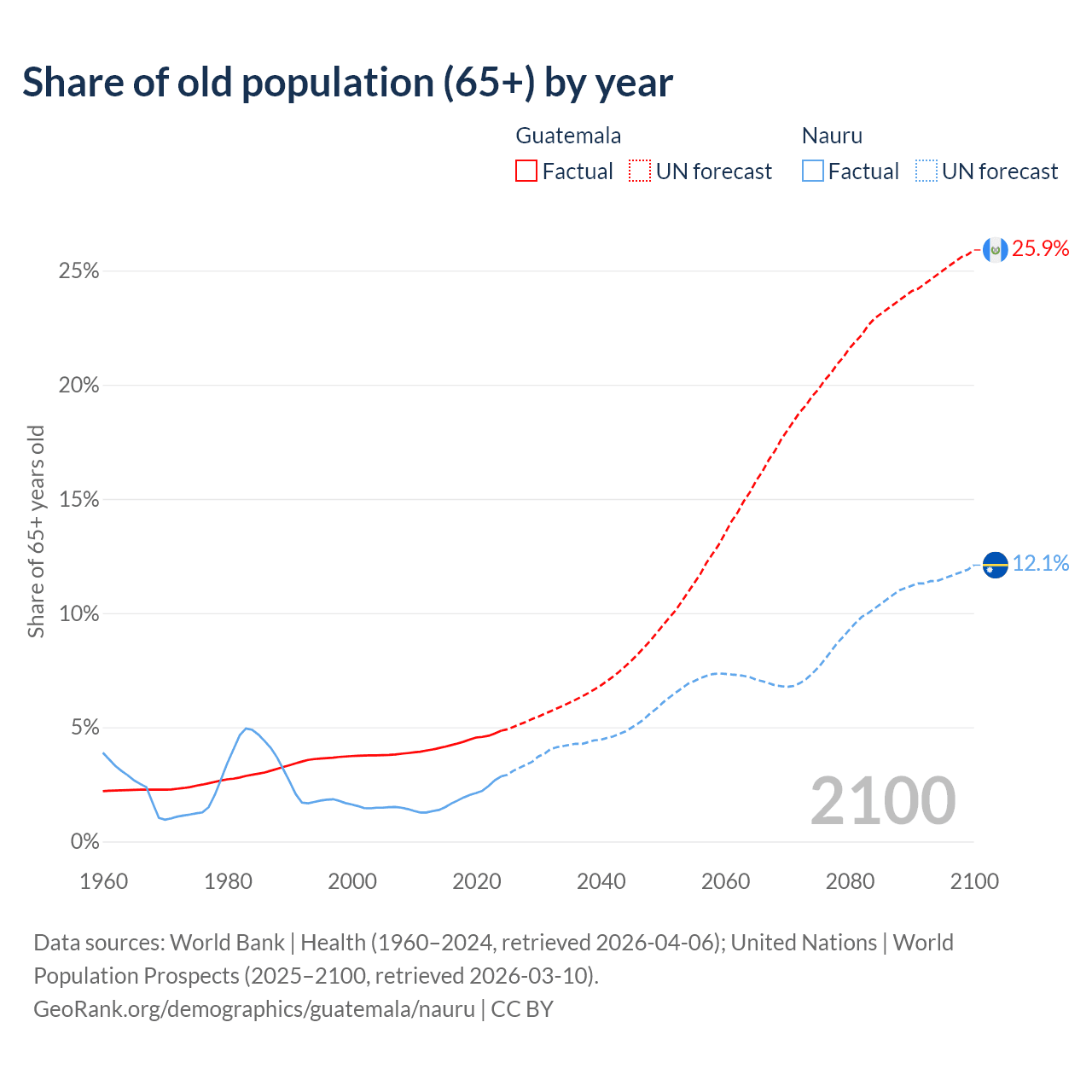 The share of older people aged 65 and over is 4.85% in Guatemala and 2.85% in Nauru. Life expectancy in Guatemala compared to Nauru .