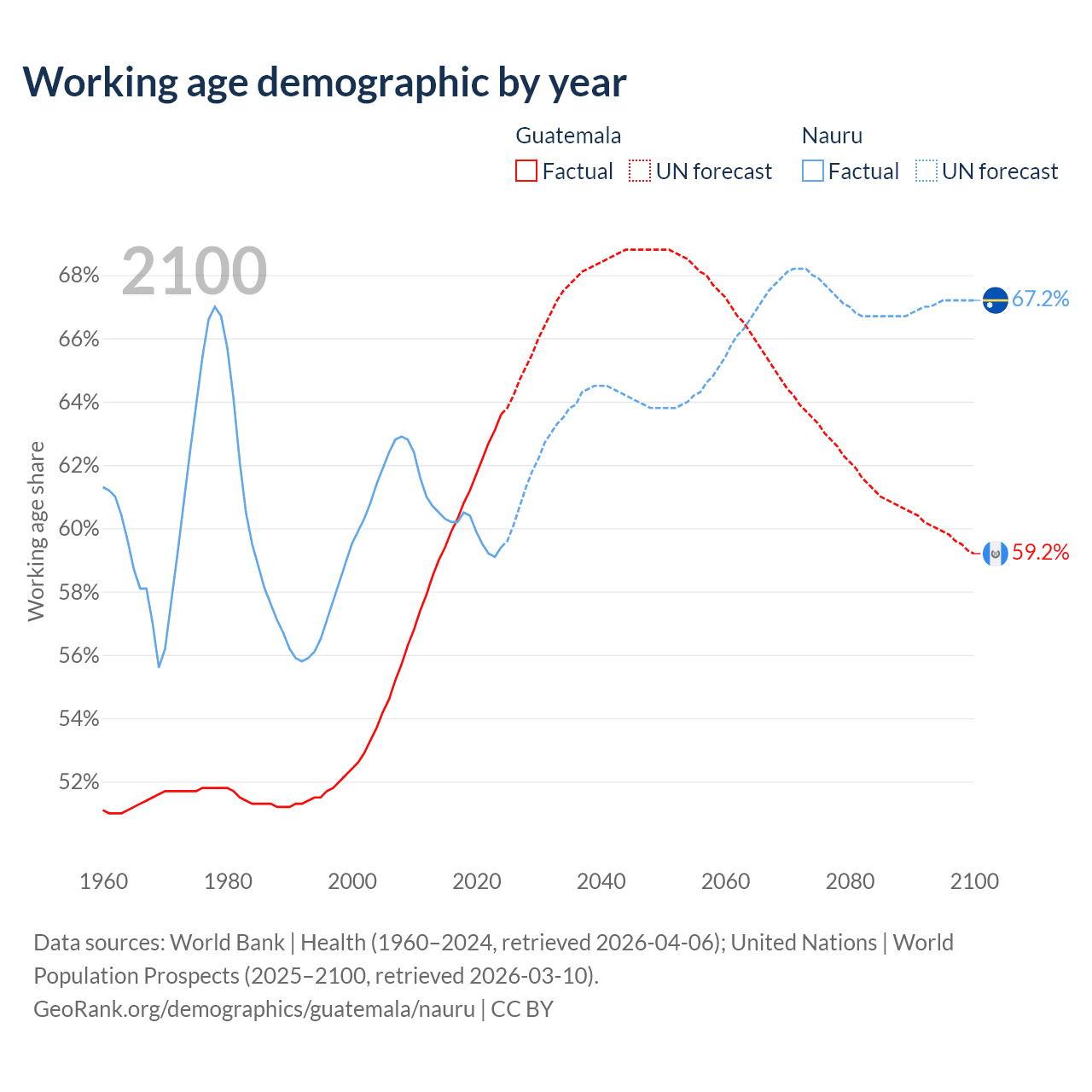 Median age Guatemala vs Nauru, 1960-2100