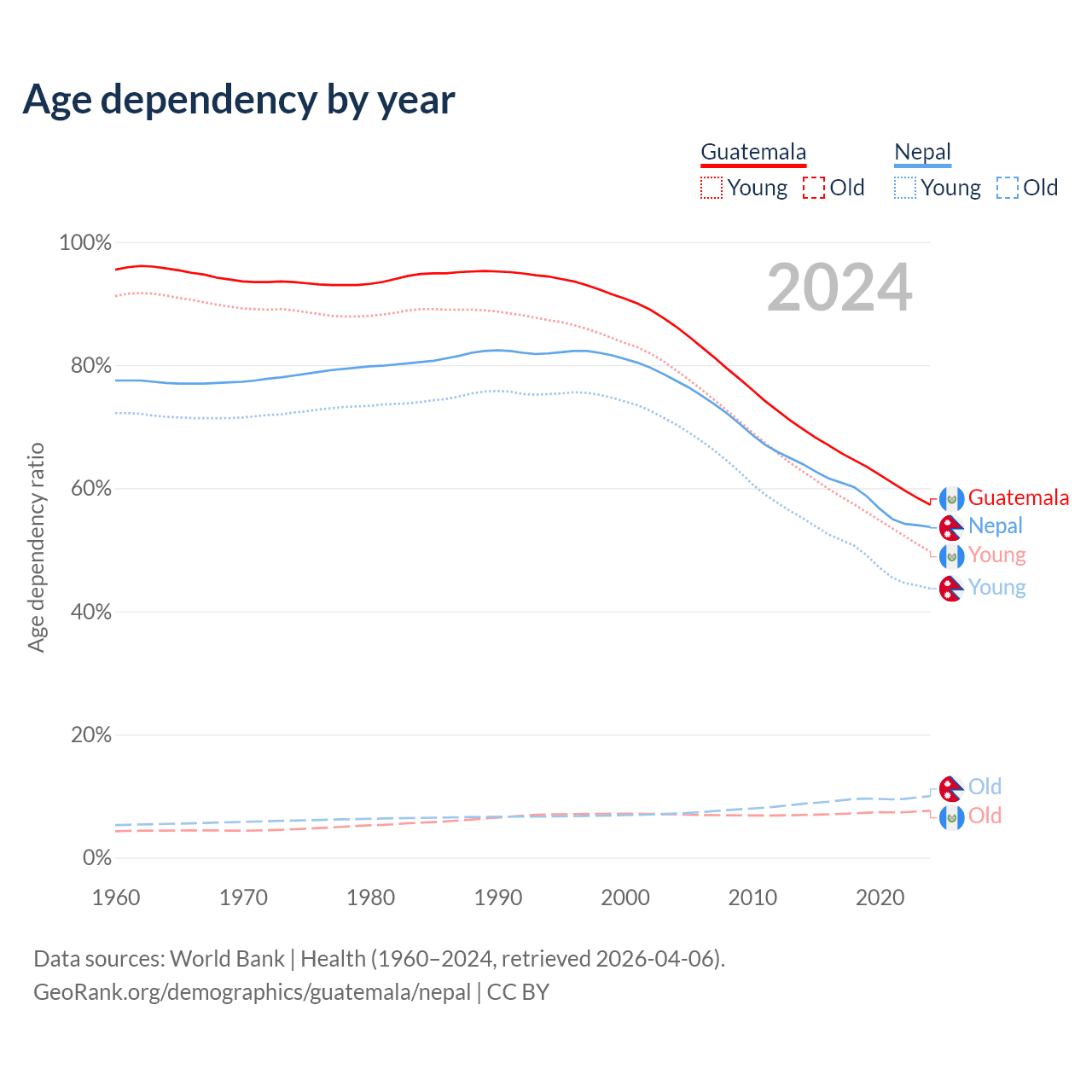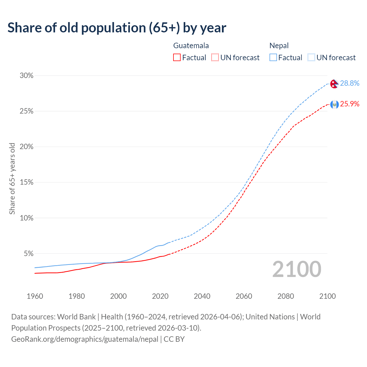 - The share of old-age demographic (65+) in Guatemala is 4.85% vs 6.5% in Nepal.