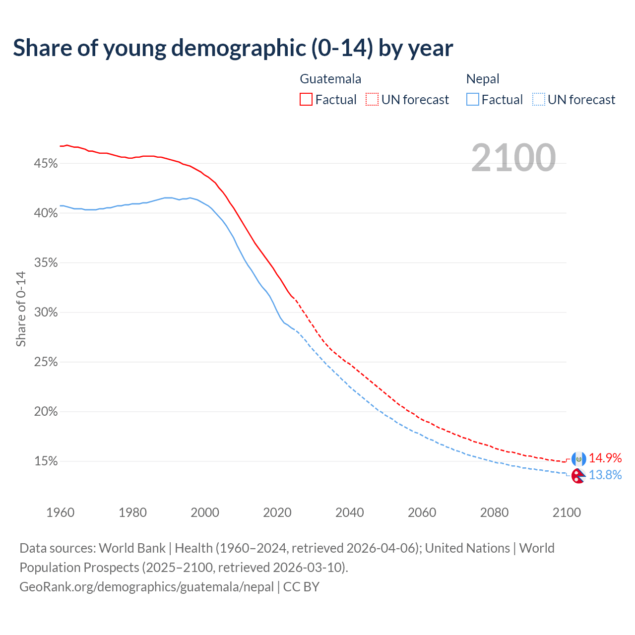 - The share of young demographic (0-15 years old) in Guatemala is 31.6% vs 28.4% in Nepal.