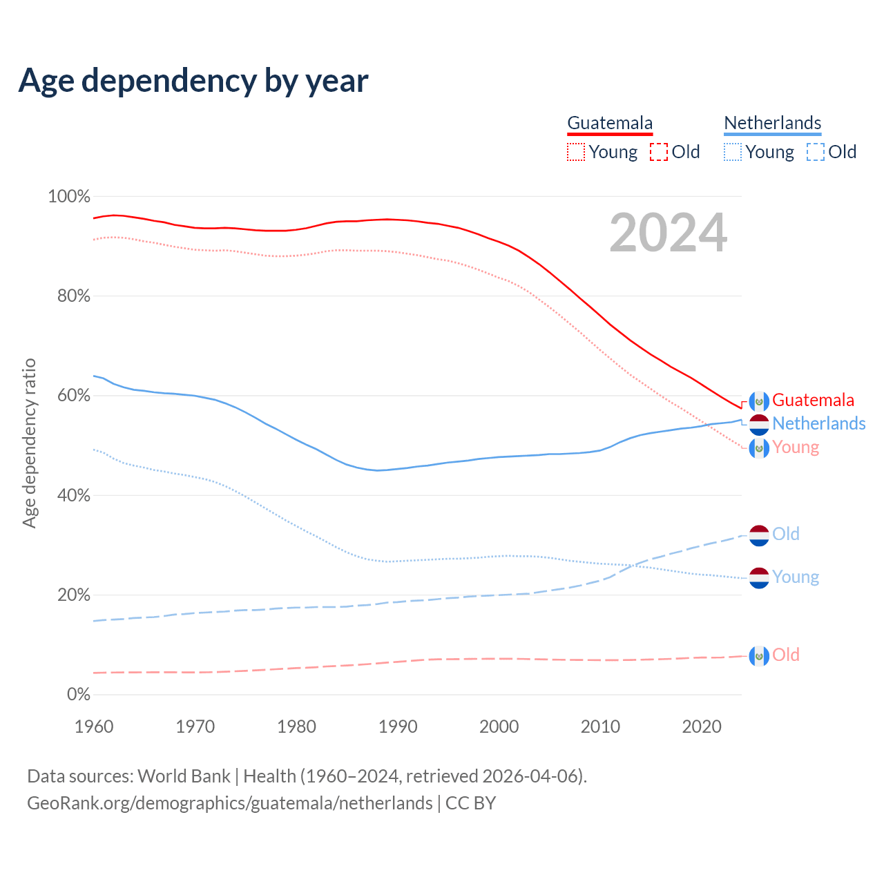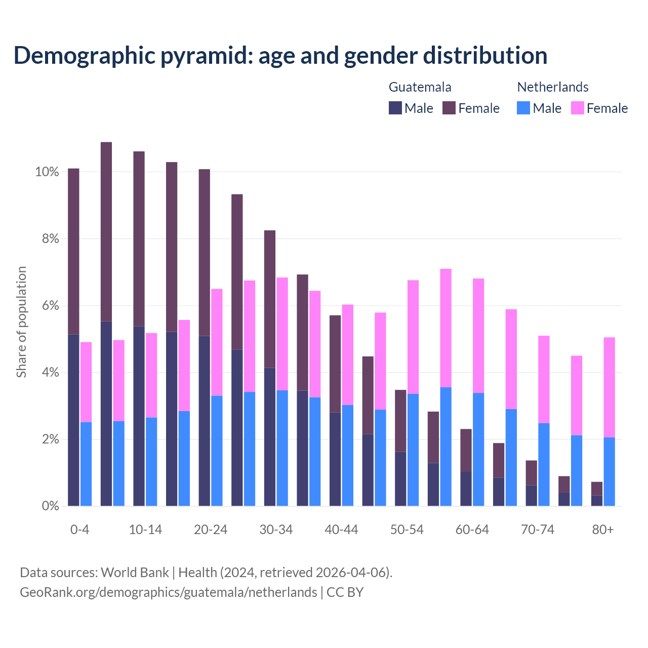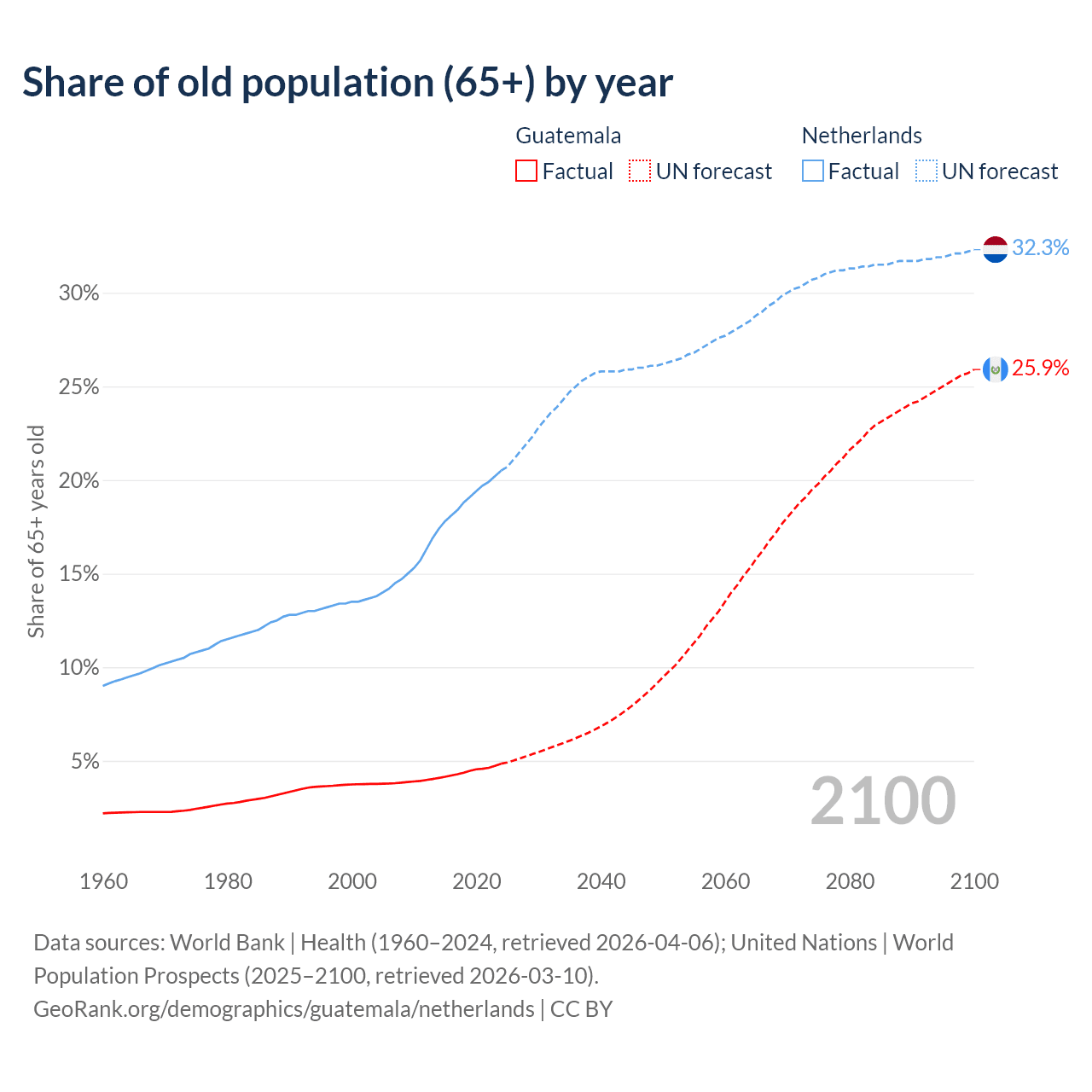 - The share of old-age demographic (65+) in Guatemala is 4.85% vs 20.5% in the Netherlands.