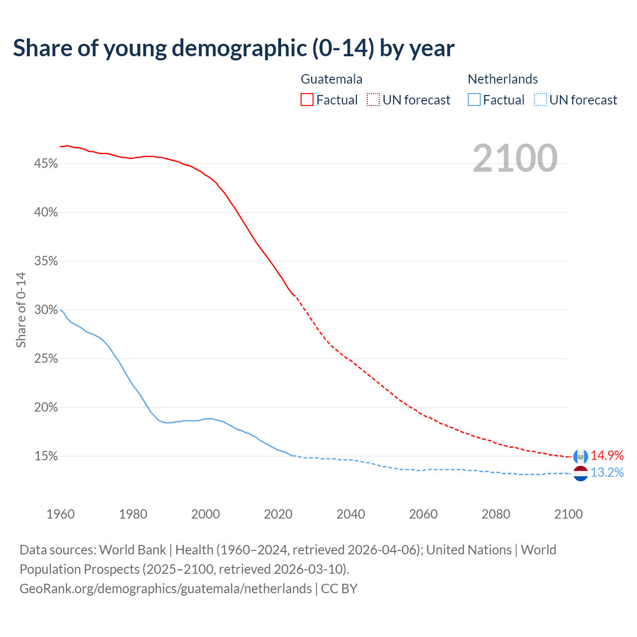 - The share of young demographic (0-15 years old) in Guatemala is 31.6% vs 15% in the Netherlands.