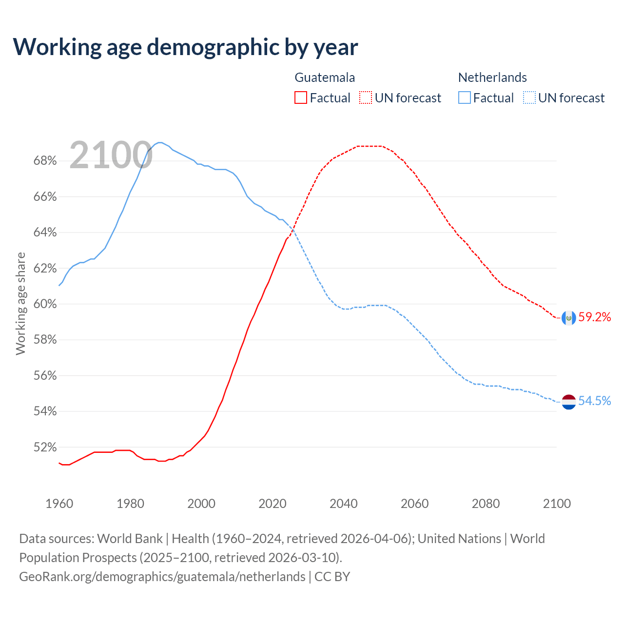 - Guatemala has 12.1M working age adults (aged 15-64) vs 11.8M in the Netherlands.