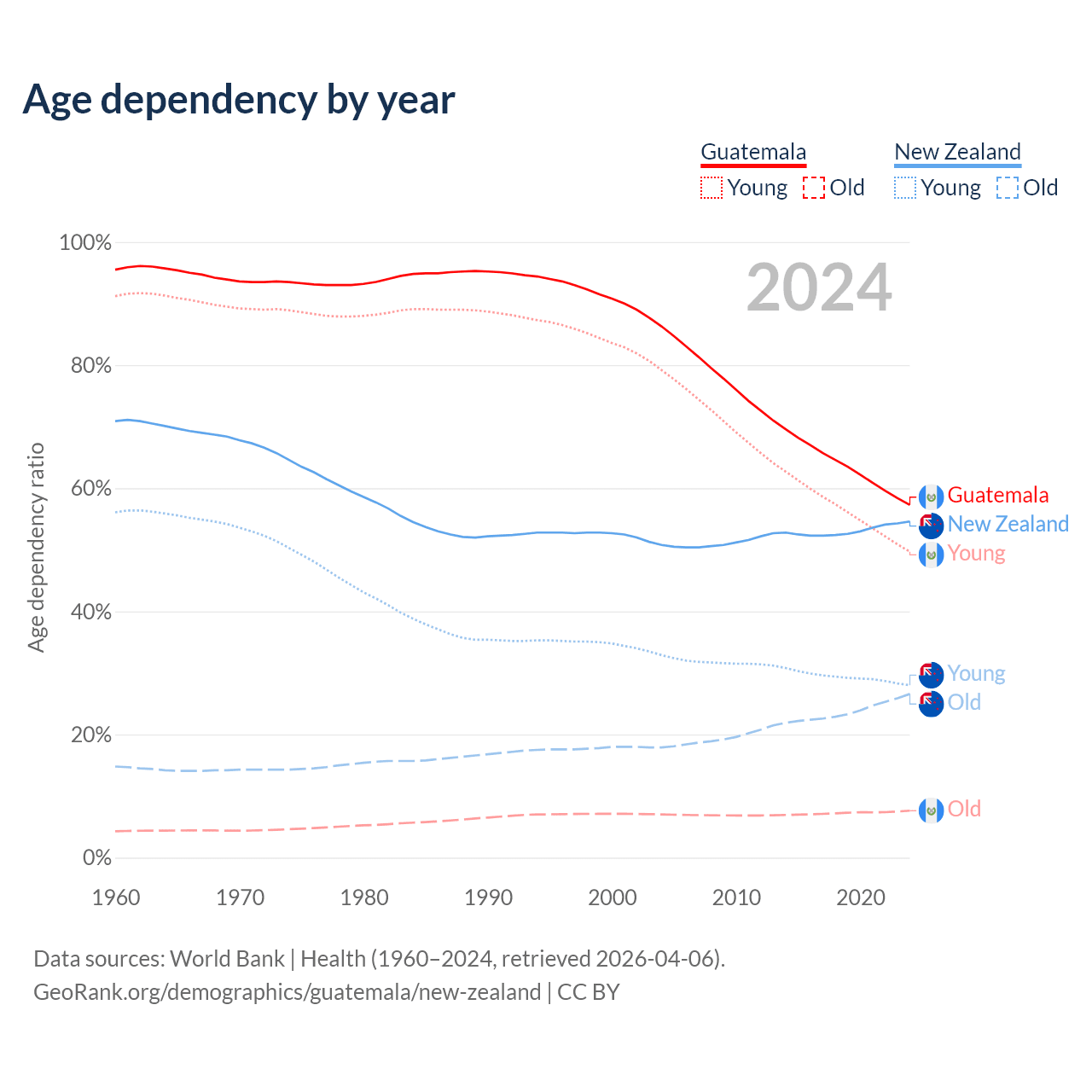 - The median age in Guatemala is 24 years compared to 38.6 years in New Zealand.
