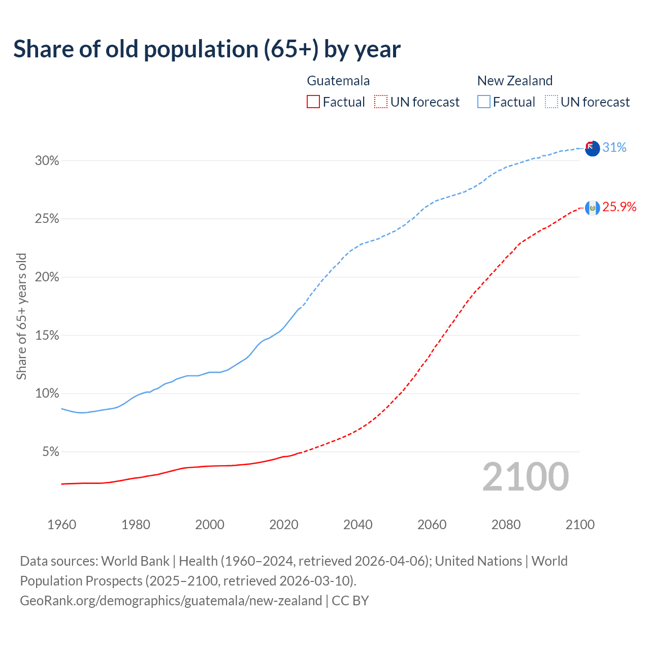 The share of older people aged 65 and over is 4.85% in Guatemala and 17.2% in New Zealand. Life expectancy in Guatemala compared to New Zealand .