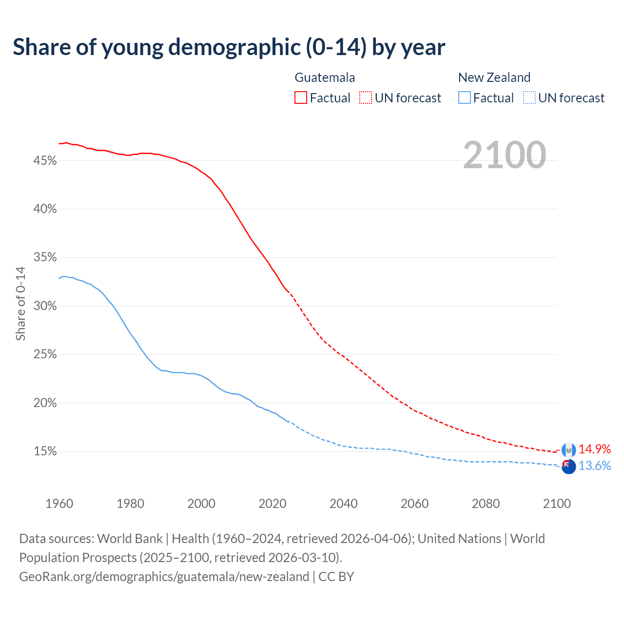 - The share of young demographic (0-15 years old) in Guatemala is 31.6% vs 18.1% in New Zealand.