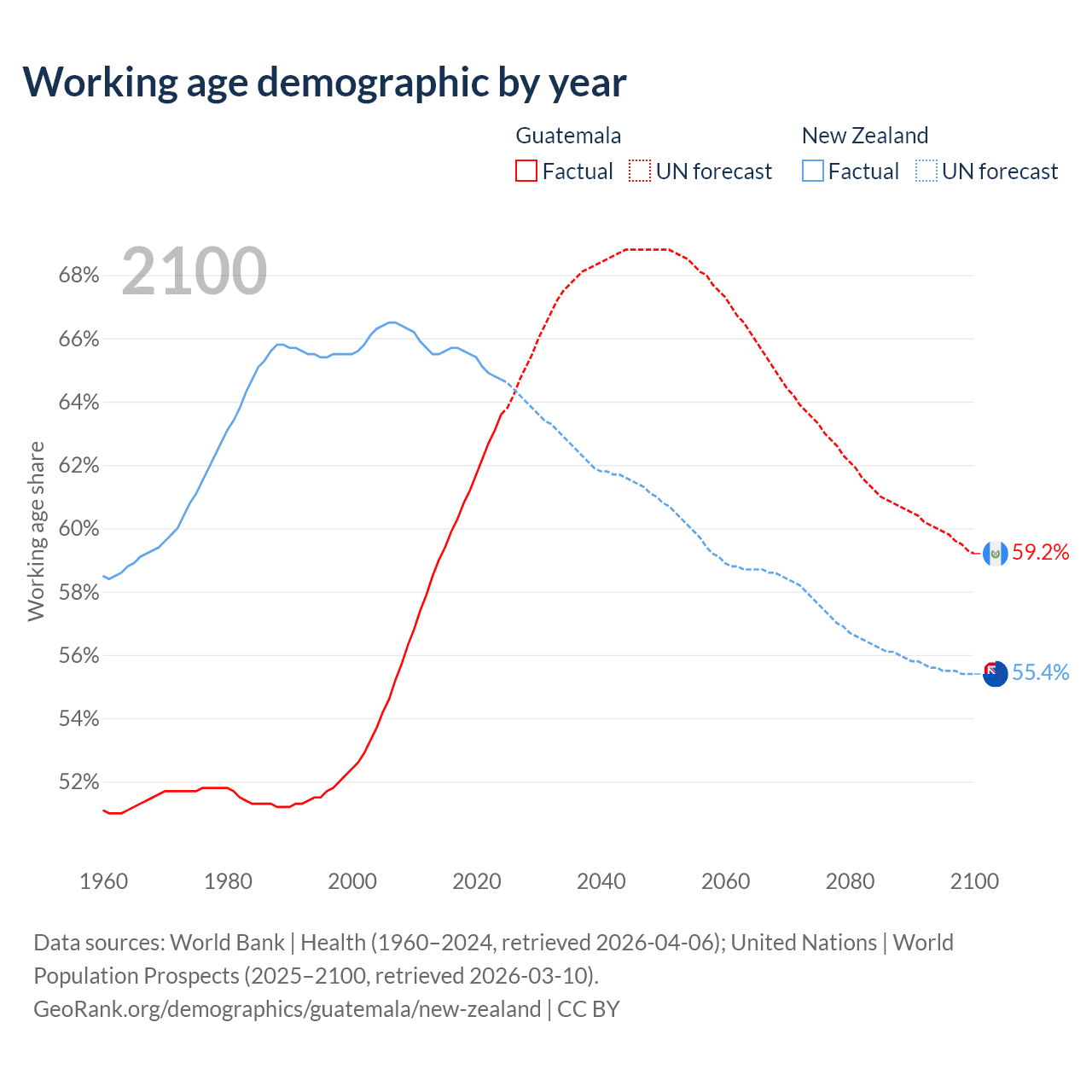 - Guatemala has 12.1M working age adults (aged 15-64) vs 3.48M in New Zealand.
