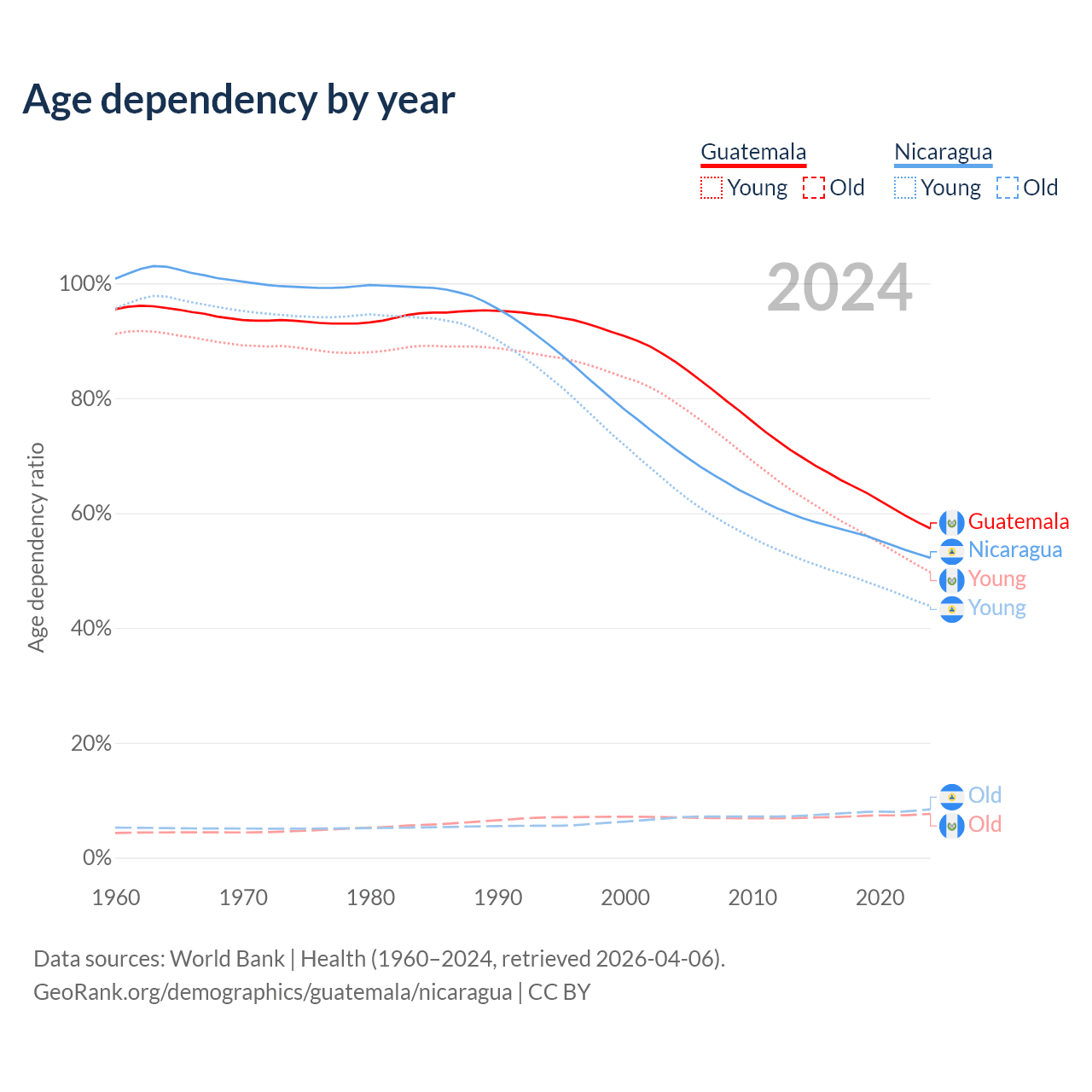 Data sources: World Bank | Health (1960–2024, retrieved 2026-04-06); U.S. Census Bureau (1960–2024, retrieved 2026-02-08).