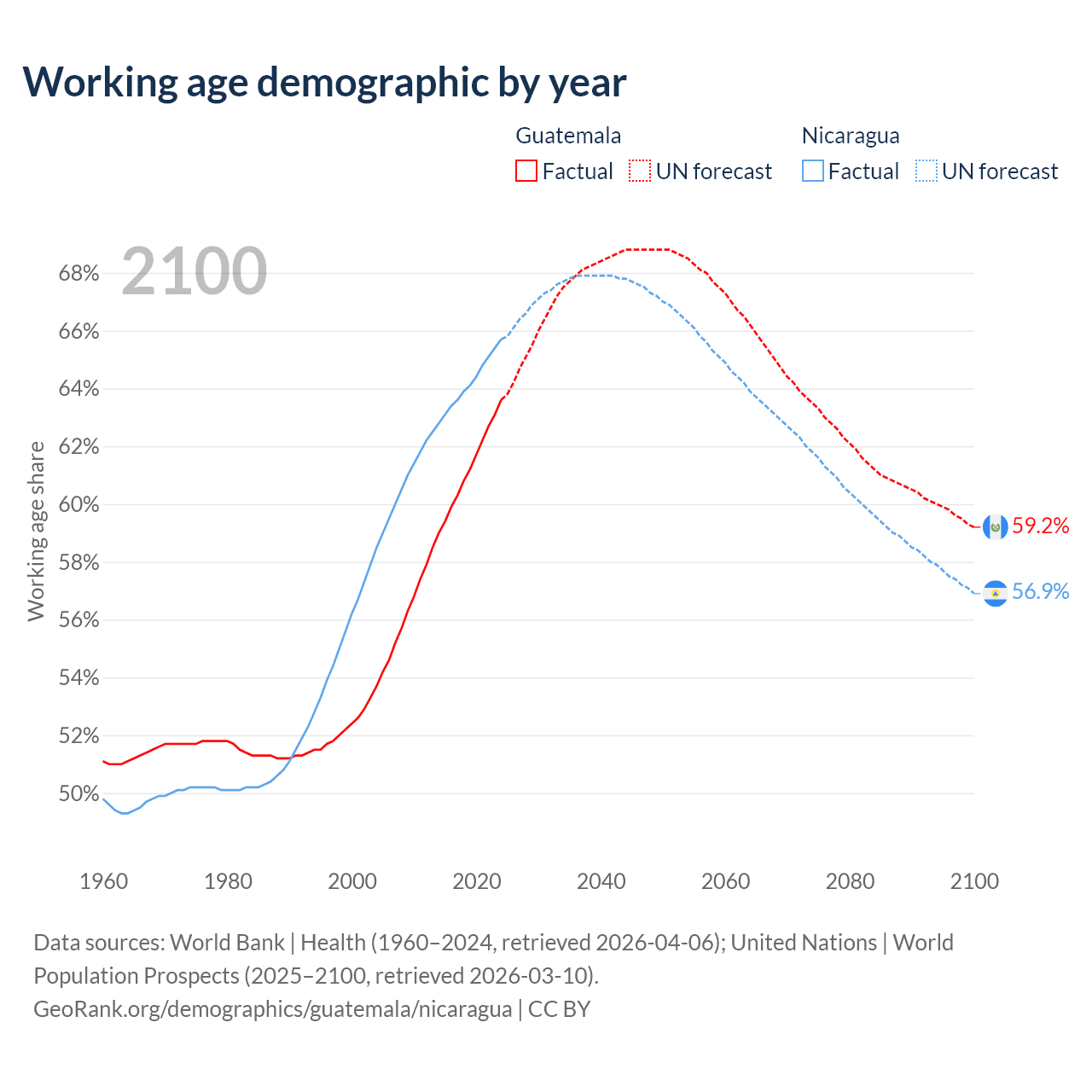 Median age Guatemala vs Nicaragua, 1960-2100