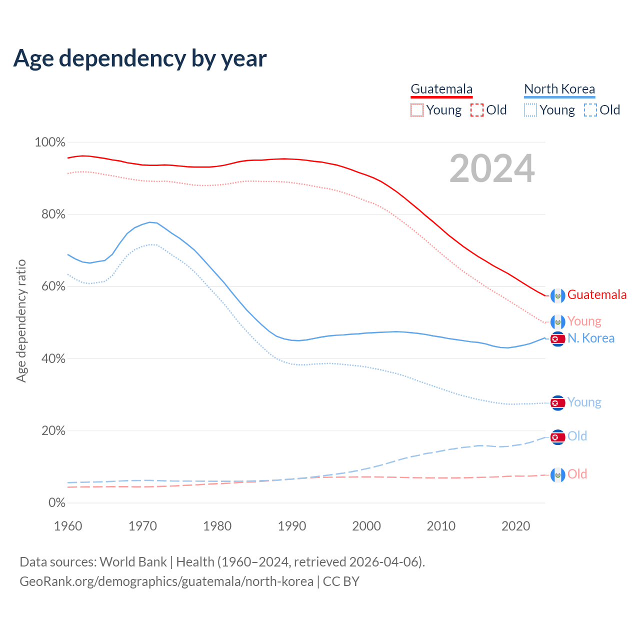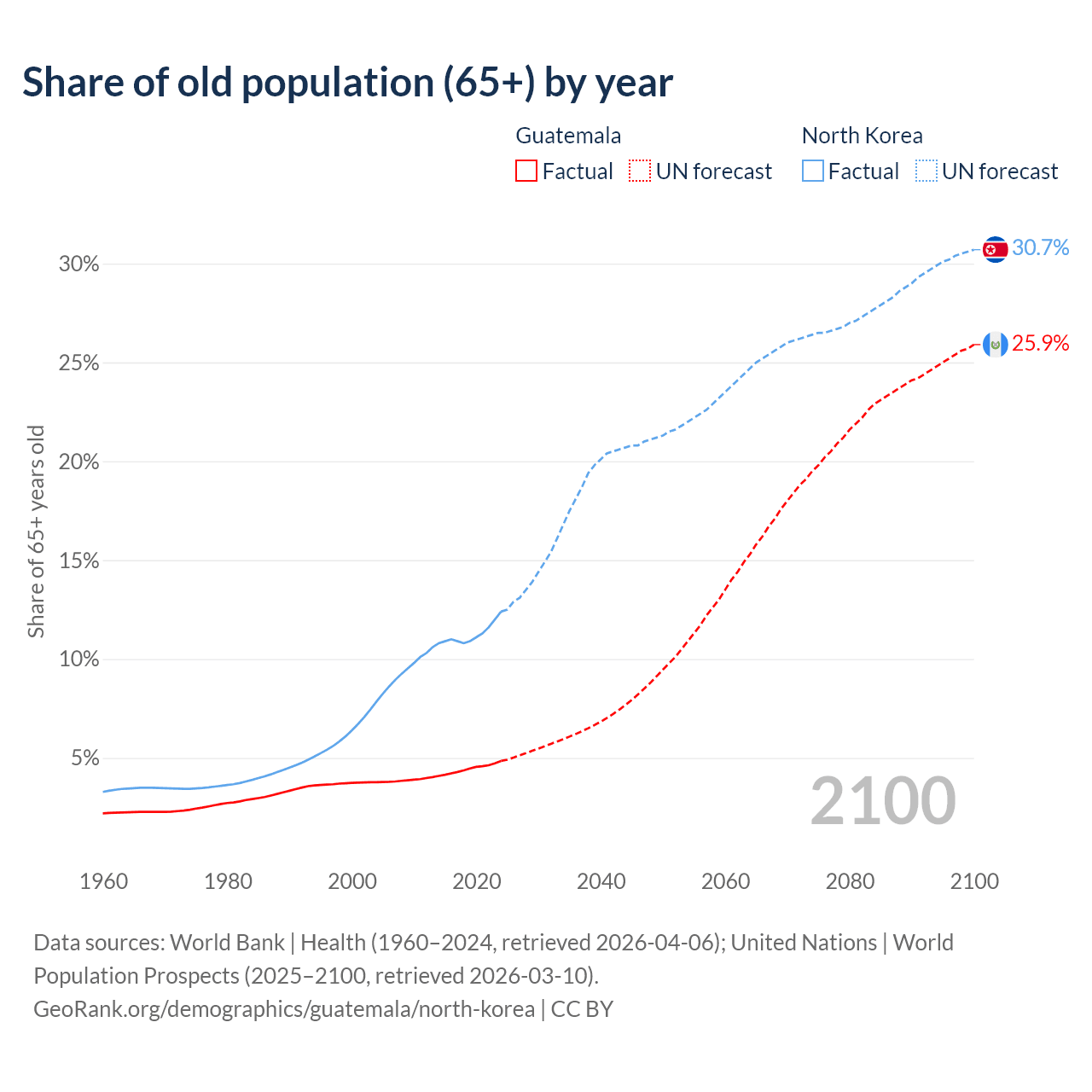 - The share of old-age demographic (65+) in Guatemala is 4.85% vs 12.4% in North Korea.