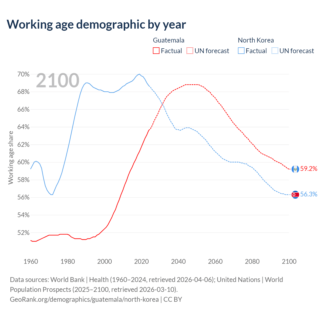 - Guatemala has 12.1M working age adults (aged 15-64) vs 18.3M in North Korea.