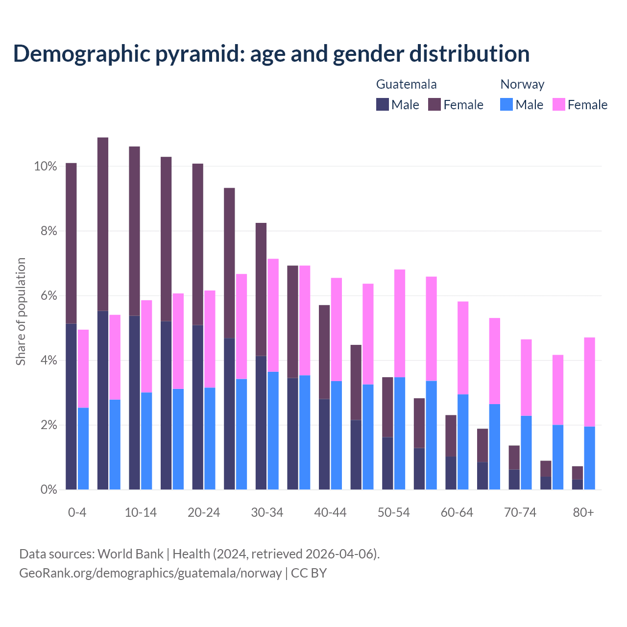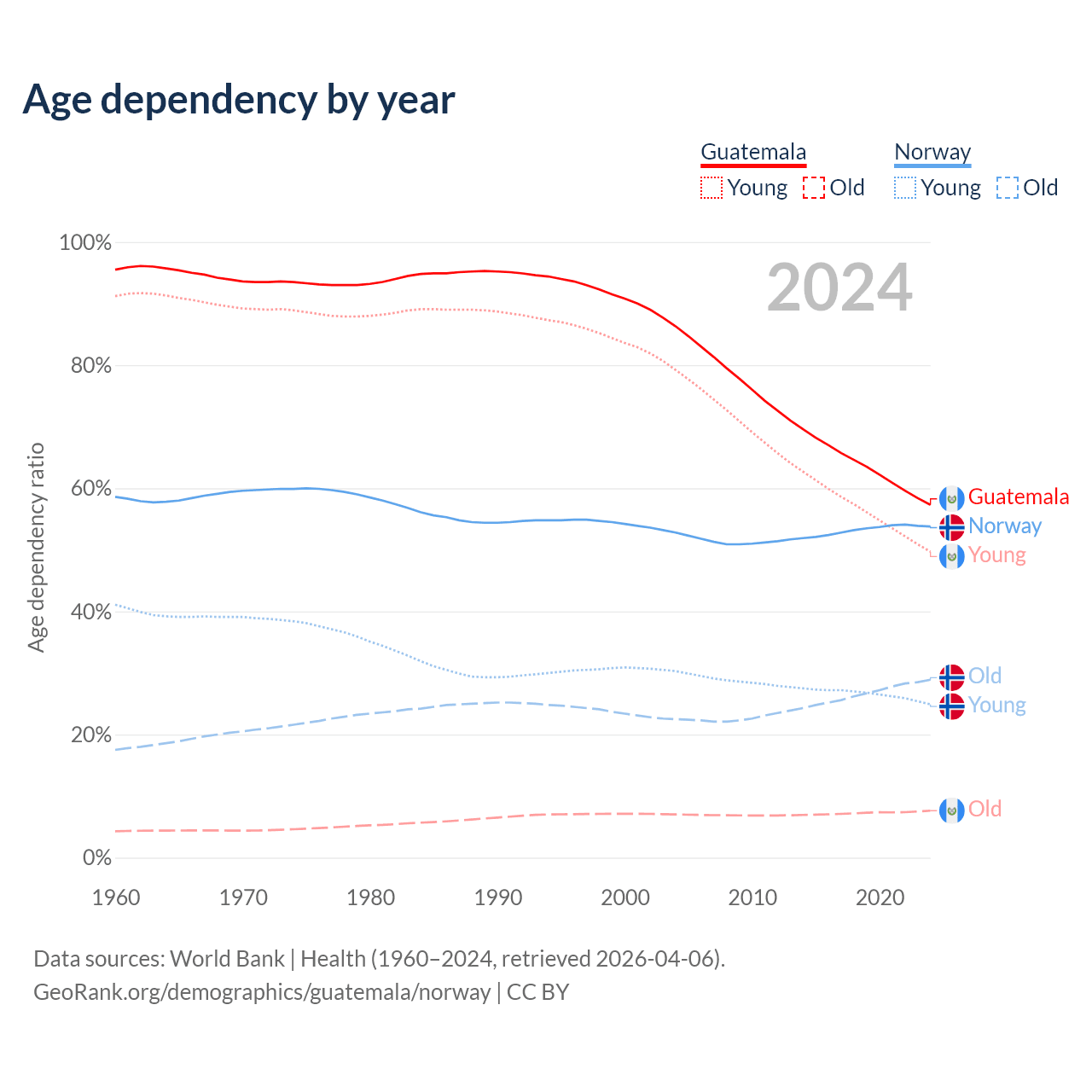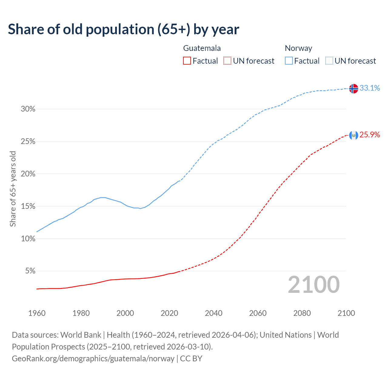 - The share of old-age demographic (65+) in Guatemala is 4.85% vs 18.8% in Norway.