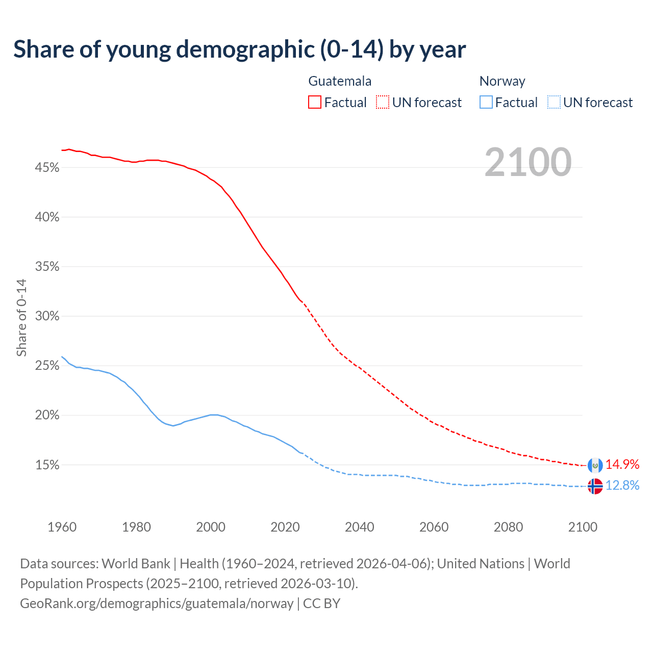 - The share of young demographic (0-15 years old) in Guatemala is 31.6% vs 16.2% in Norway.