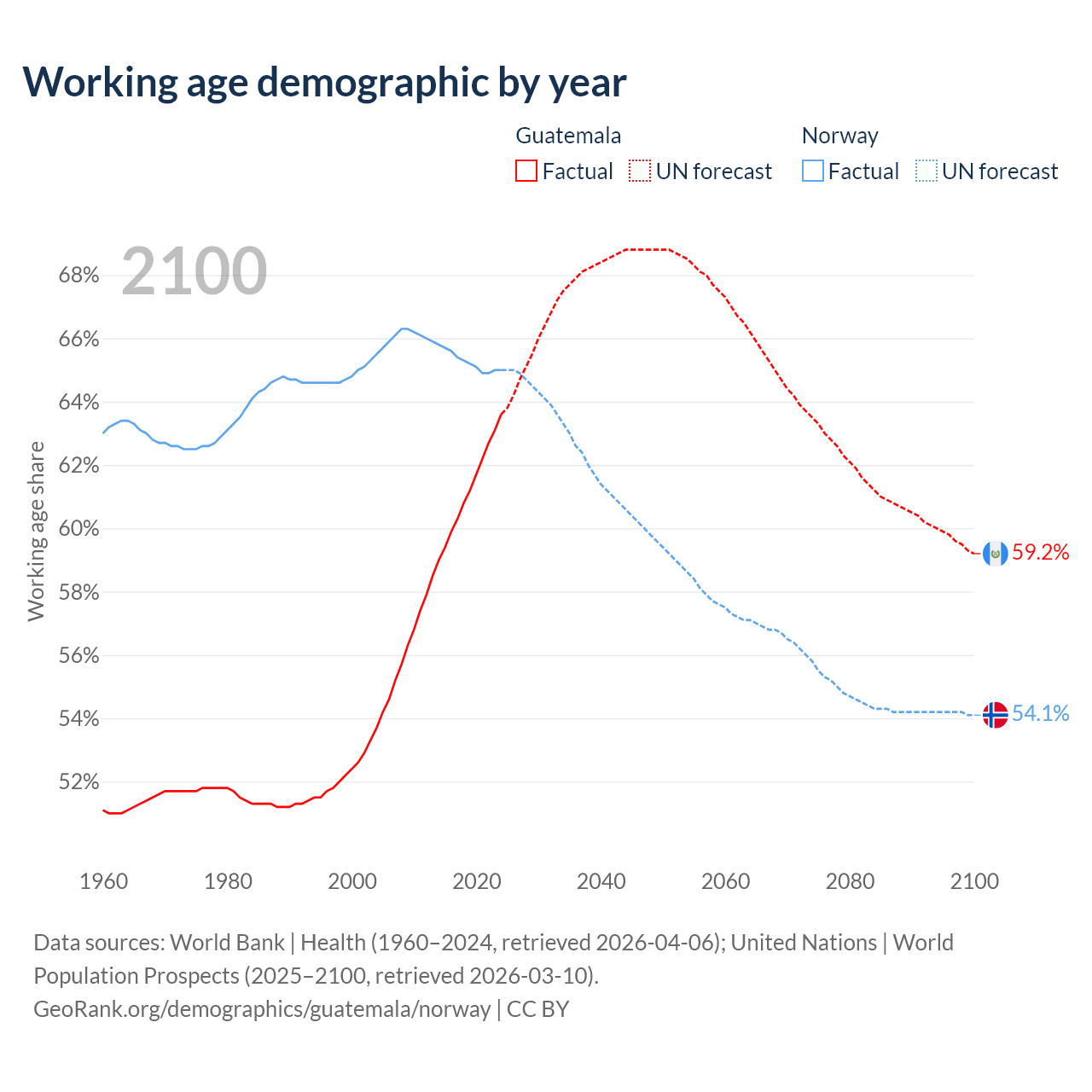 - Guatemala has 12.1M working age adults (aged 15-64) vs 3.69M in Norway.