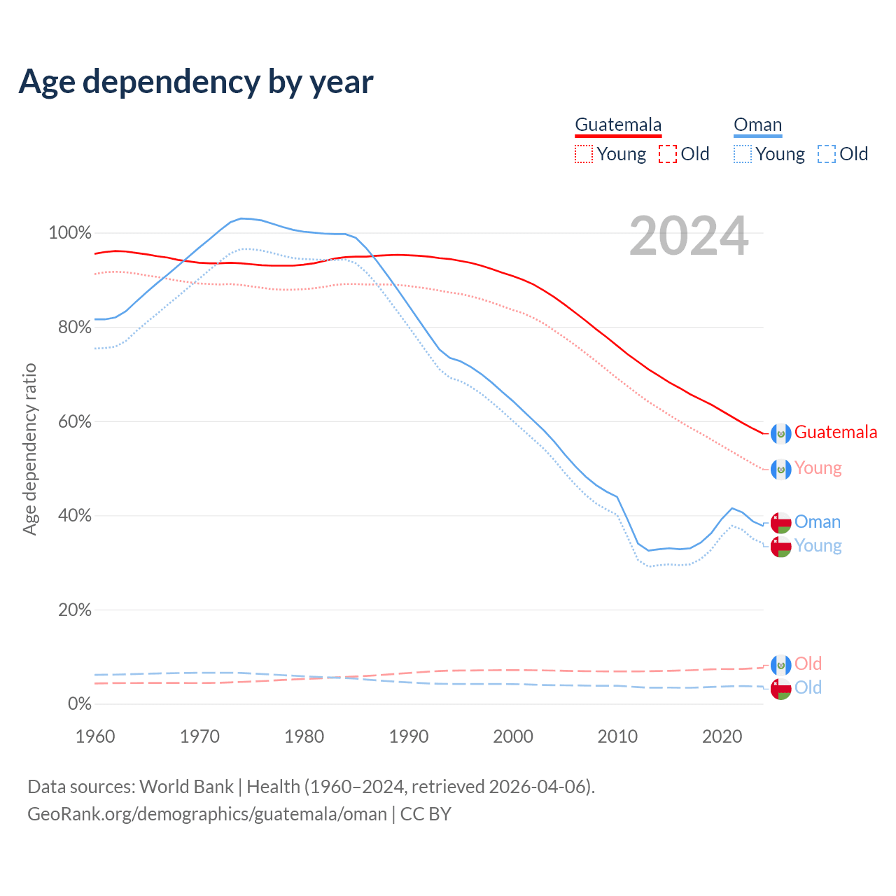 - Guatemala is ranked 137/196 by median age (oldest to youngest) vs 101/196 for Oman.