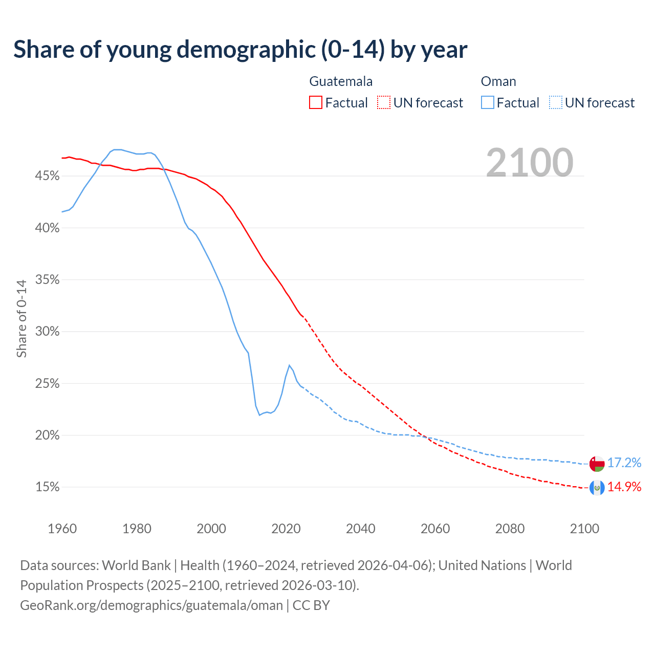 - The share of young demographic (0-15 years old) in Guatemala is 31.6% vs 24.7% in Oman.