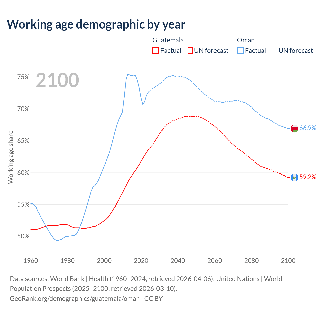 - Guatemala has 12.1M working age adults (aged 15-64) vs 4.19M in Oman.