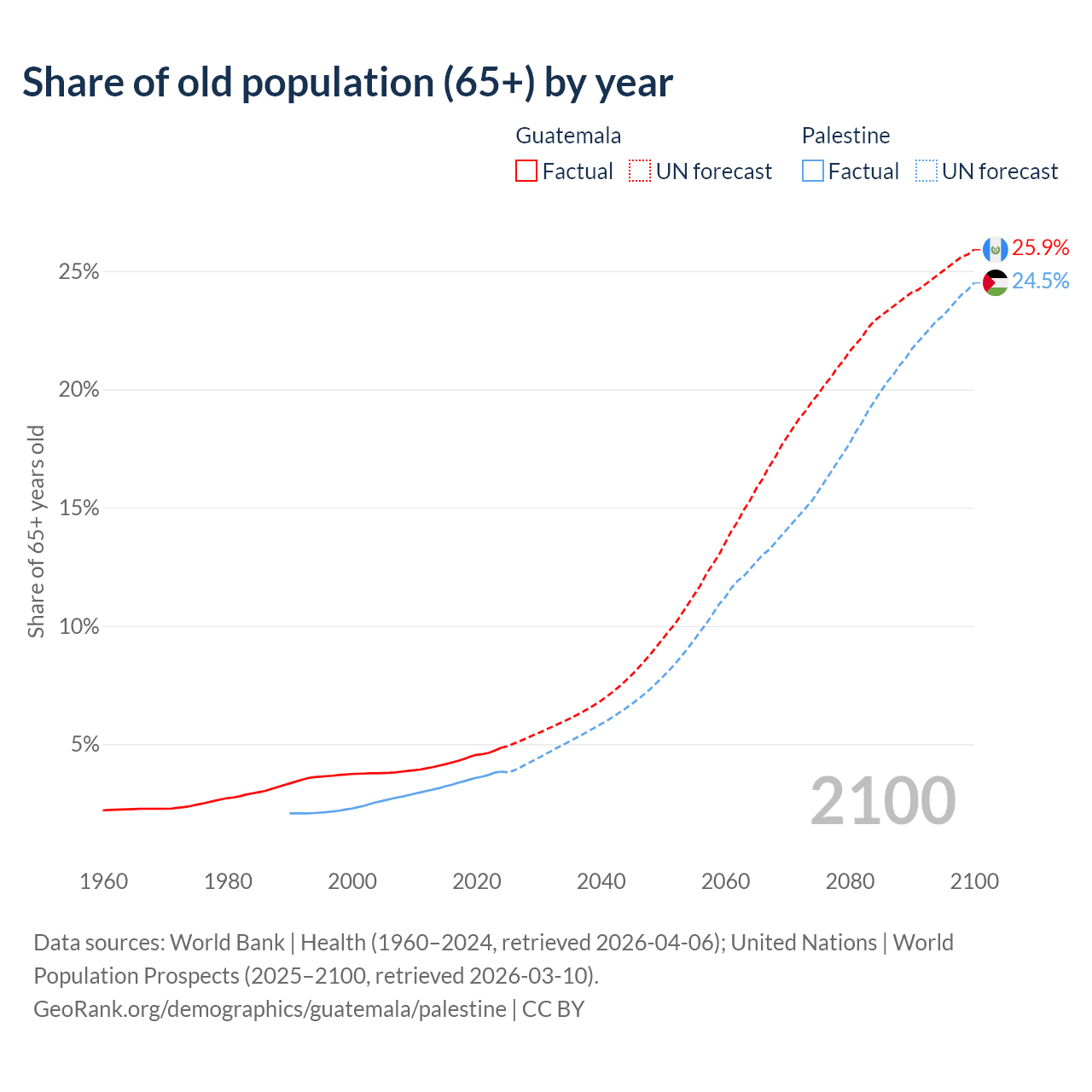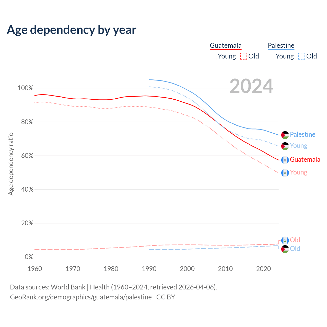 - The share of old-age demographic (65+) in Guatemala is 4.85% vs 3.84% in Palestine.