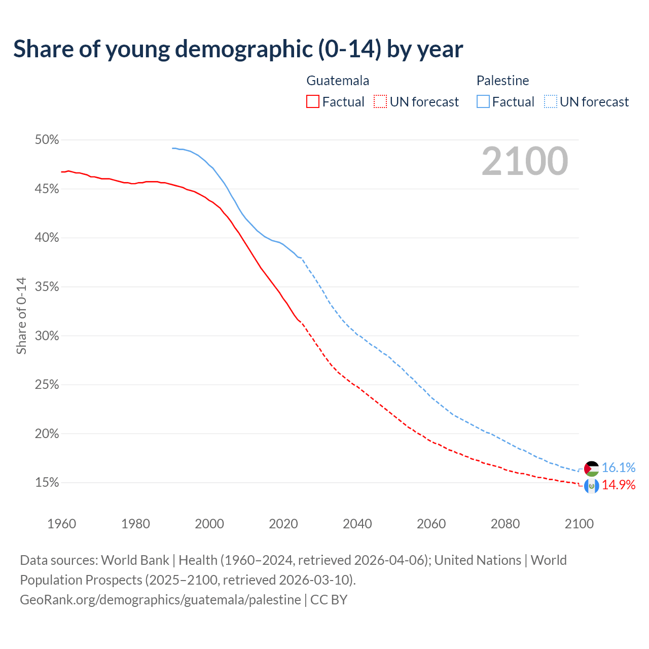 - The share of young demographic (0-15 years old) in Guatemala is 31.6% vs 38% in Palestine.