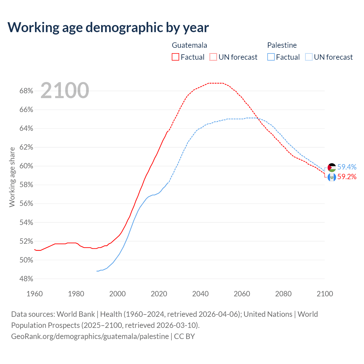 - Guatemala has 12.1M working age adults (aged 15-64) vs 3.2M in Palestine.
