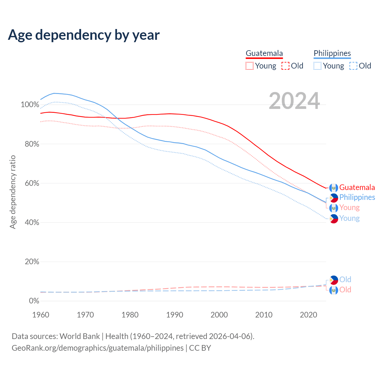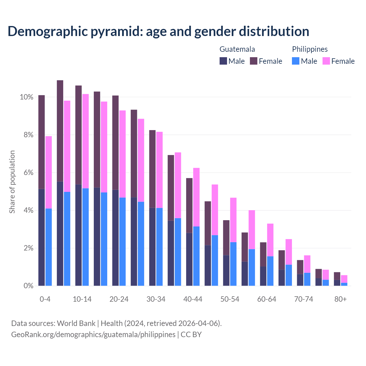 - Guatemala is ranked 137/196 by median age (oldest to youngest) vs 123/196 for the Philippines.