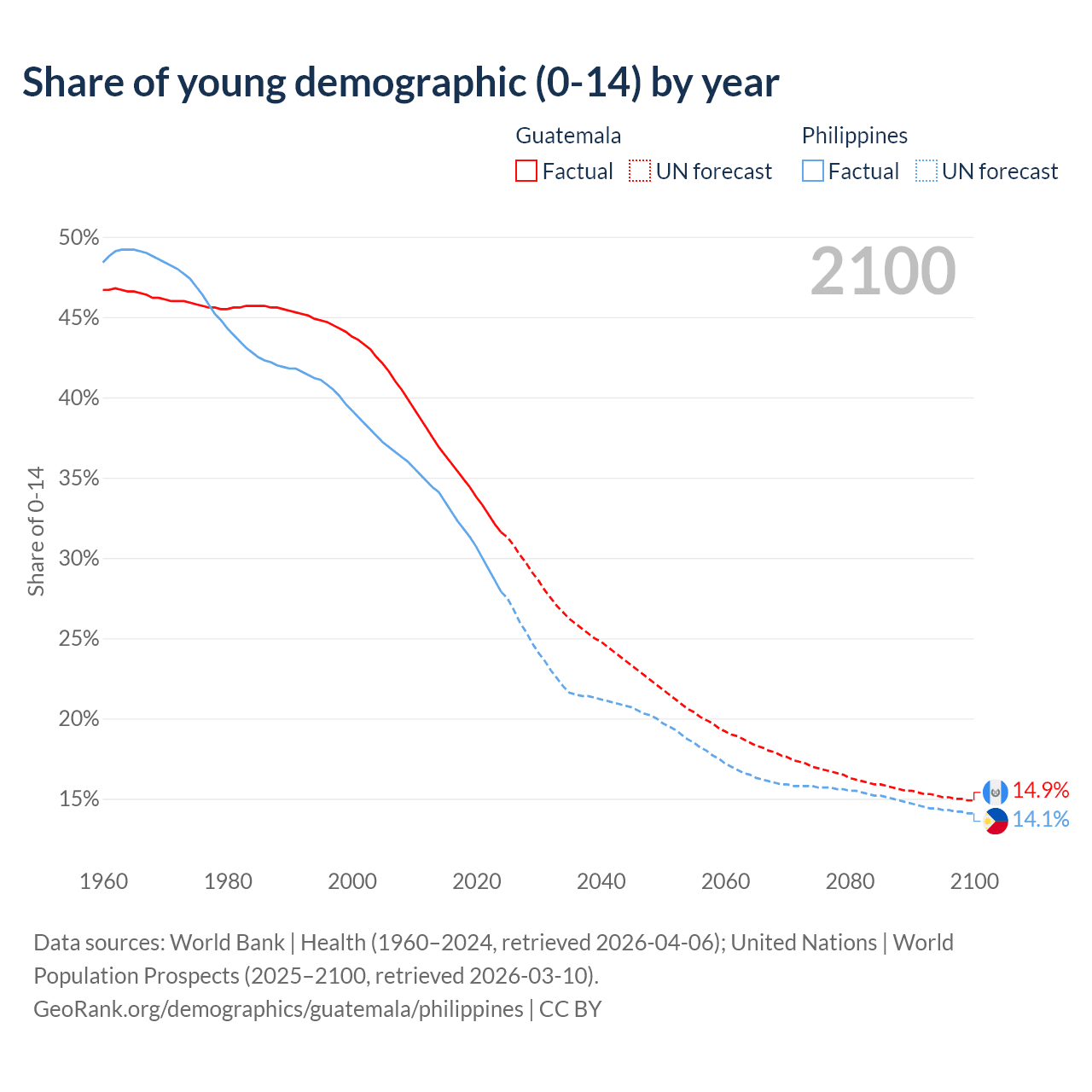 - The share of young demographic (0-15 years old) in Guatemala is 31.6% vs 27.9% in the Philippines.