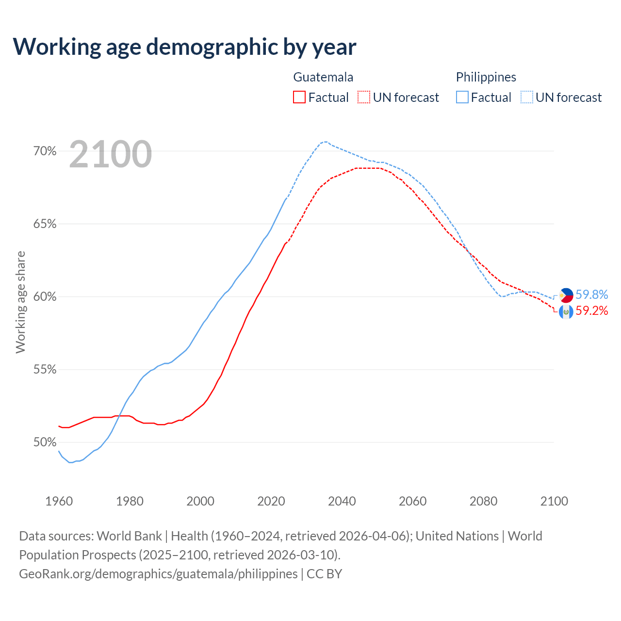 - Guatemala has 12.1M working age adults (aged 15-64) vs 78.6M in the Philippines.