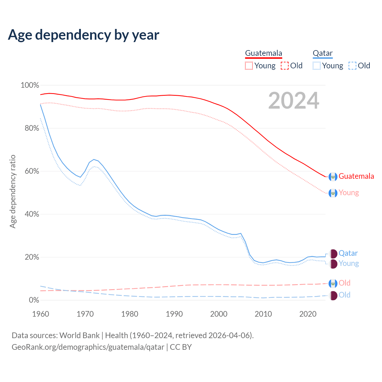 - The median age in Guatemala is 24 years compared to 34.5 years in Qatar.
