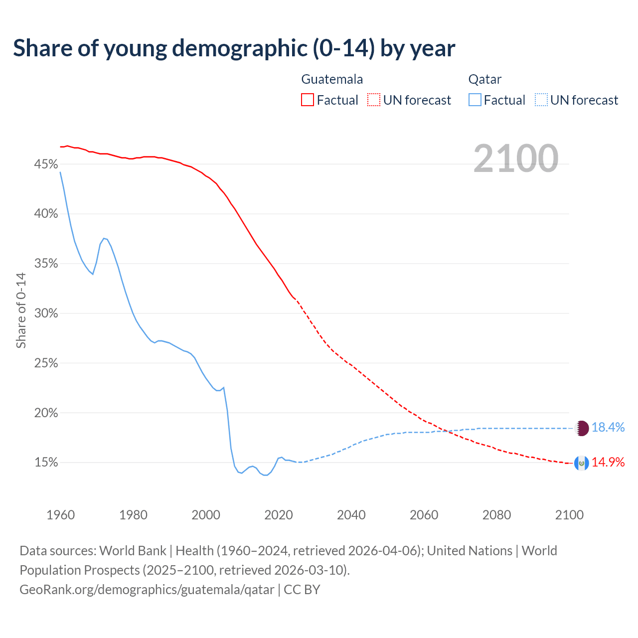 - The share of young demographic (0-15 years old) in Guatemala is 31.6% vs 15.1% in Qatar.