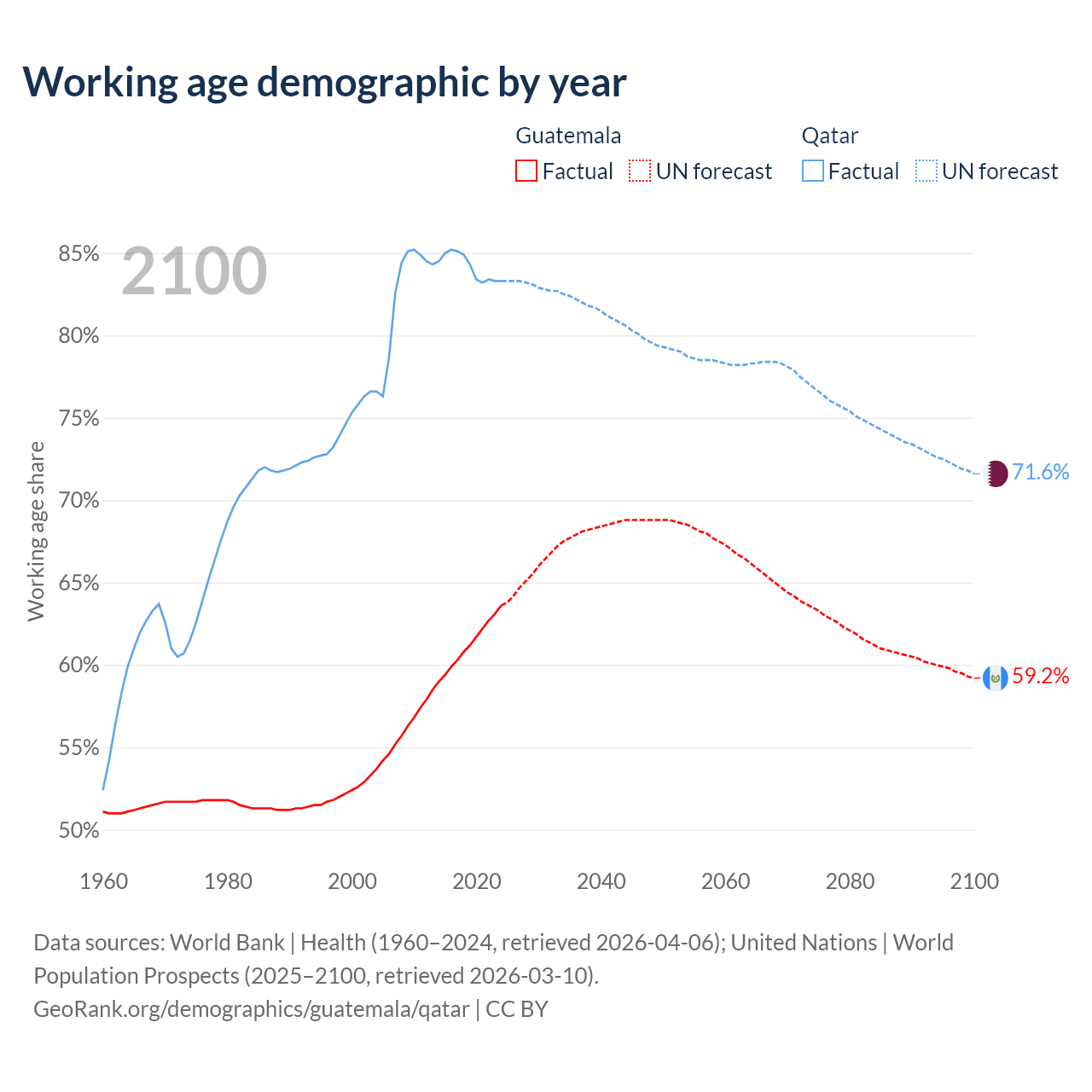 - Guatemala has 12.1M working age adults (aged 15-64) vs 2.5M in Qatar.