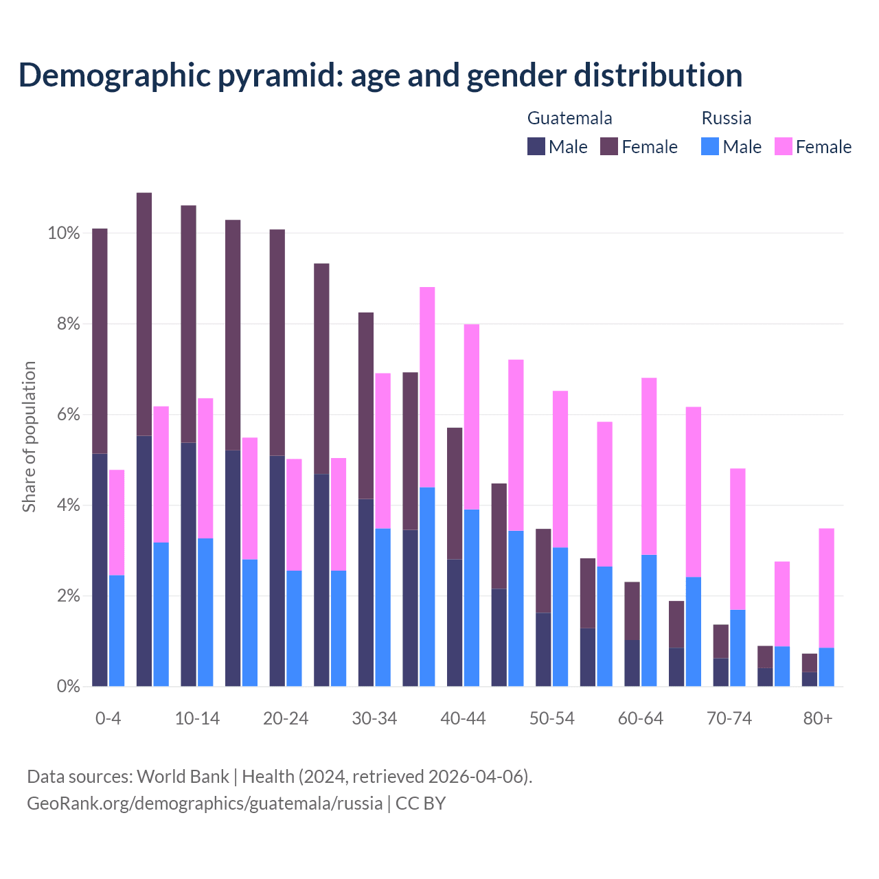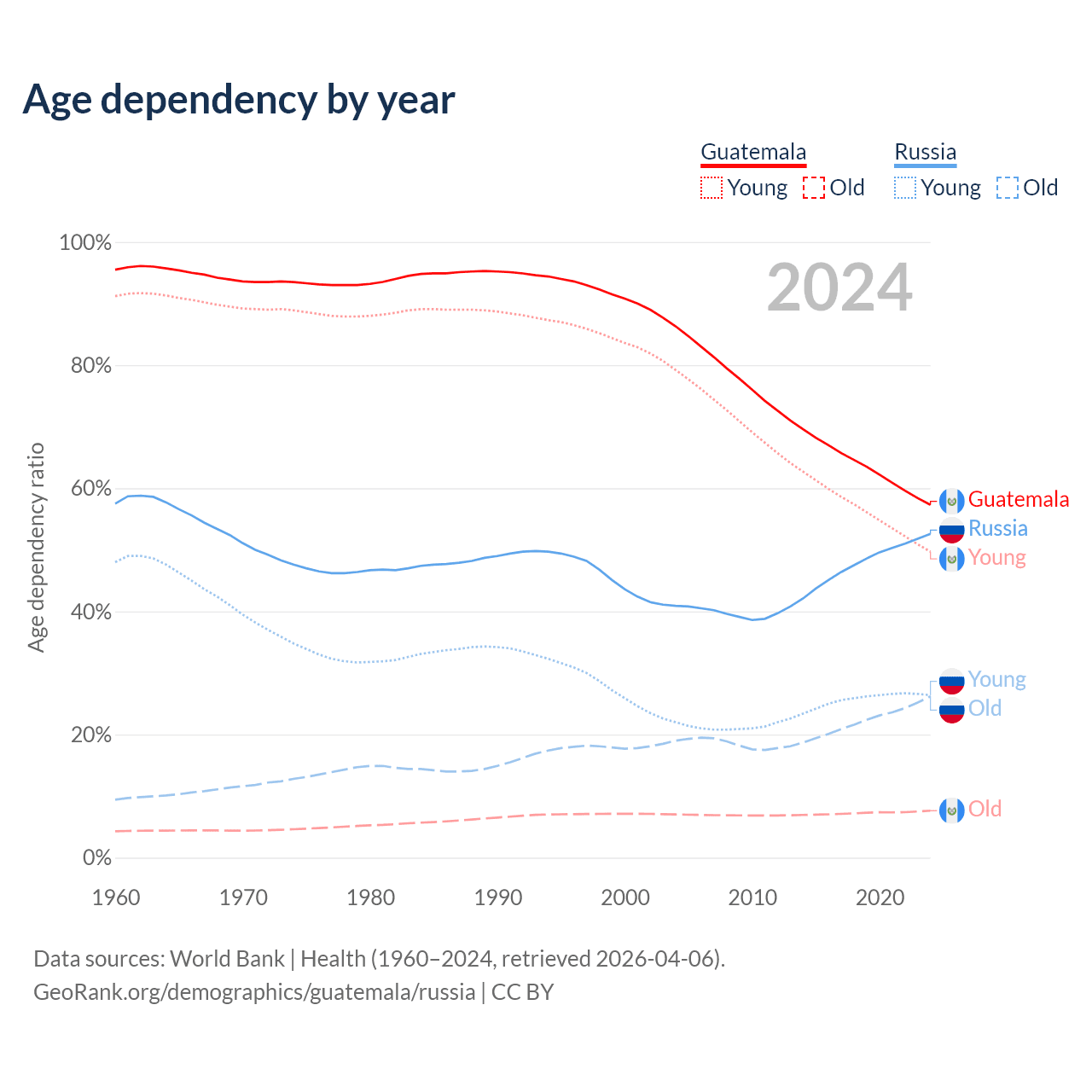 - Guatemala is ranked 137/196 by median age (oldest to youngest) vs 42/196 for Russia.