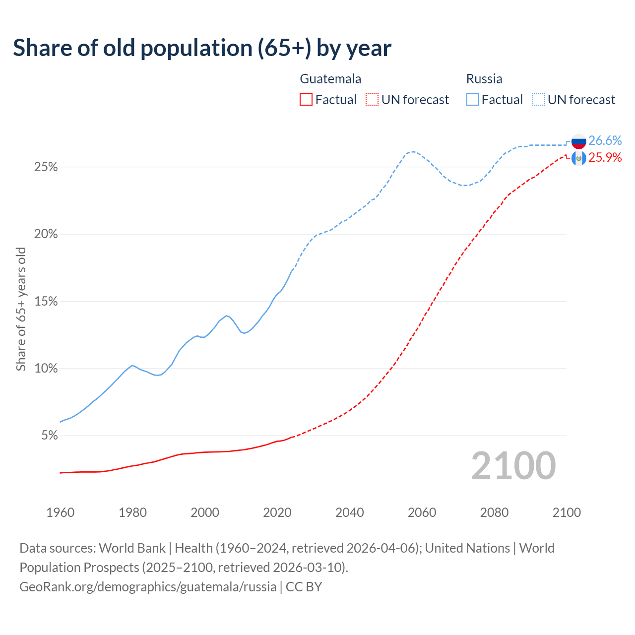 The share of older people aged 65 and over is 4.85% in Guatemala and 17.2% in Russia. Life expectancy in Guatemala compared to Russia .
