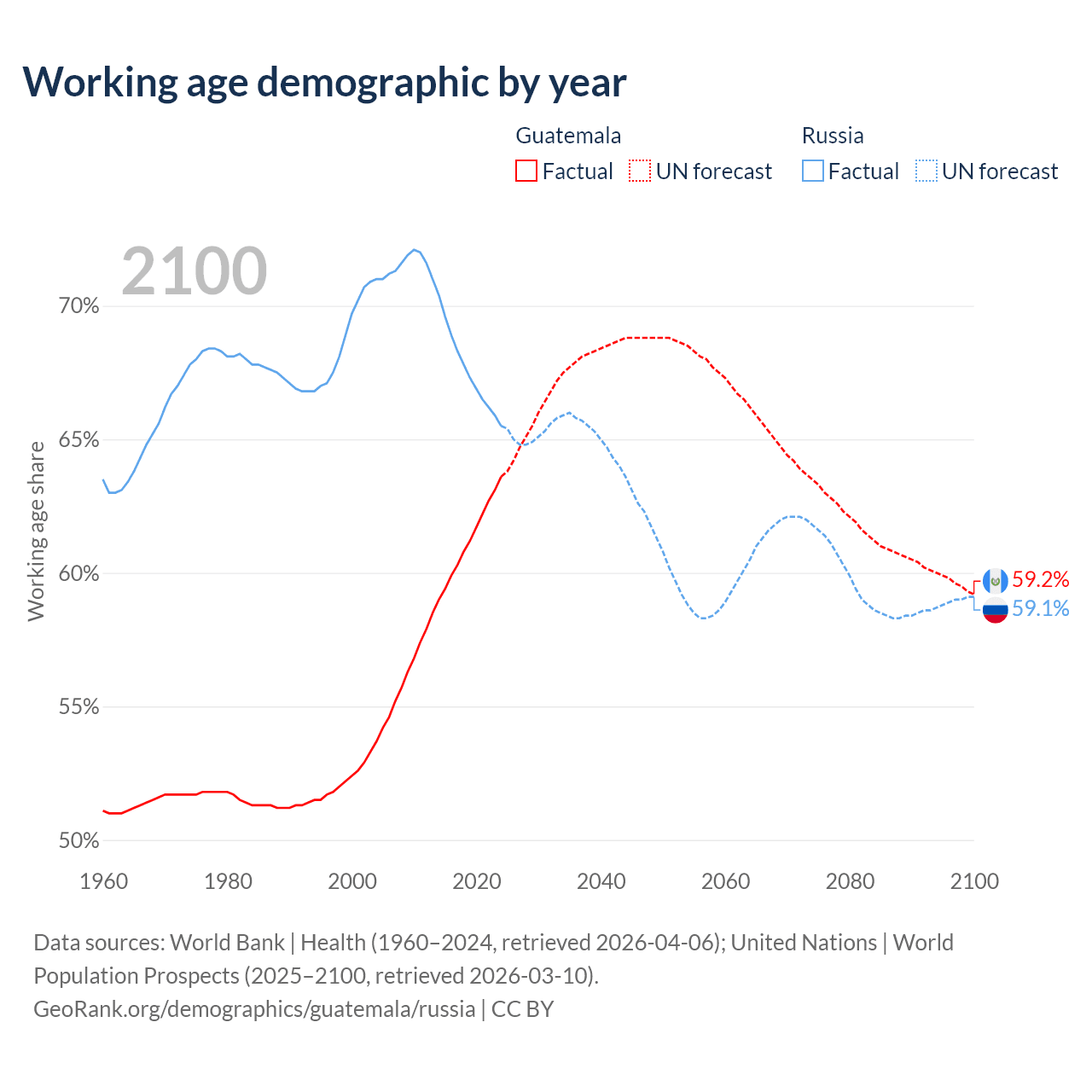 - Guatemala has 12.1M working age adults (aged 15-64) vs 93M in Russia.