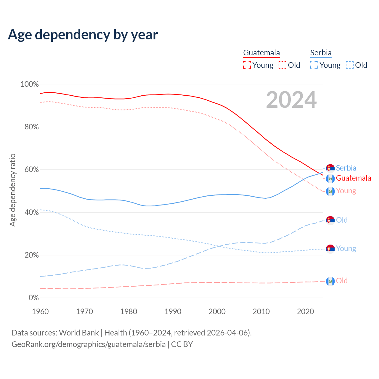 - The median age in Guatemala is 24 years compared to 45.1 years in Serbia.