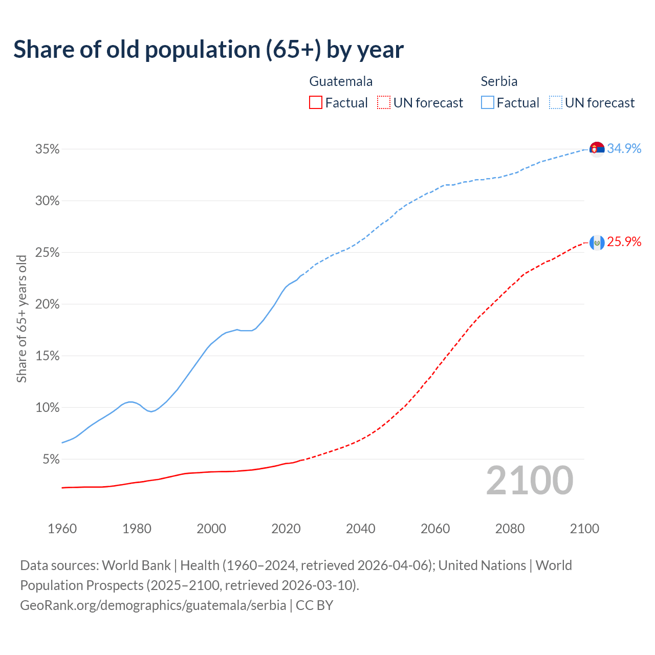 The share of older people aged 65 and over is 4.85% in Guatemala and 22.7% in Serbia. Life expectancy in Guatemala compared to Serbia .