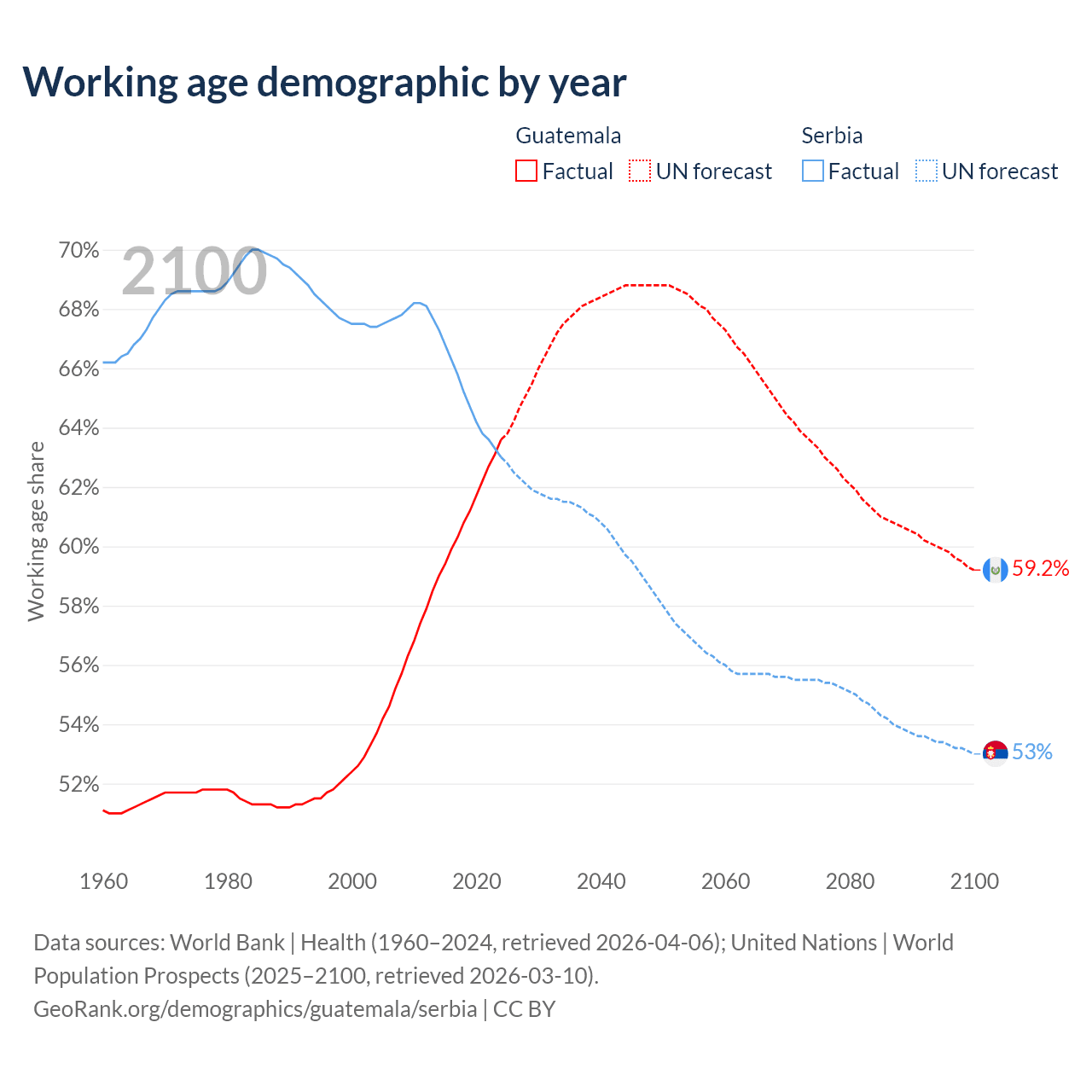 Median age Guatemala vs Serbia, 1960-2100