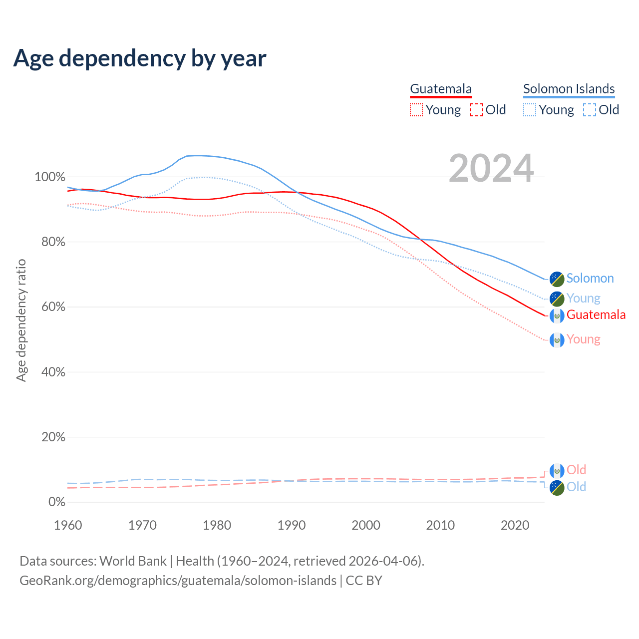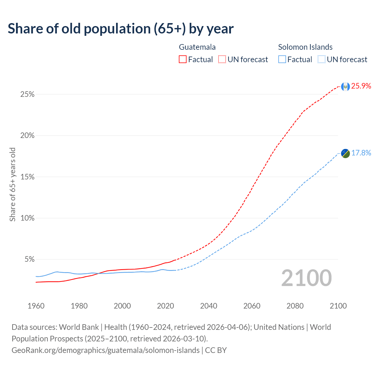 - The share of old-age demographic (65+) in Guatemala is 4.85% vs 3.64% in the Solomon Islands.