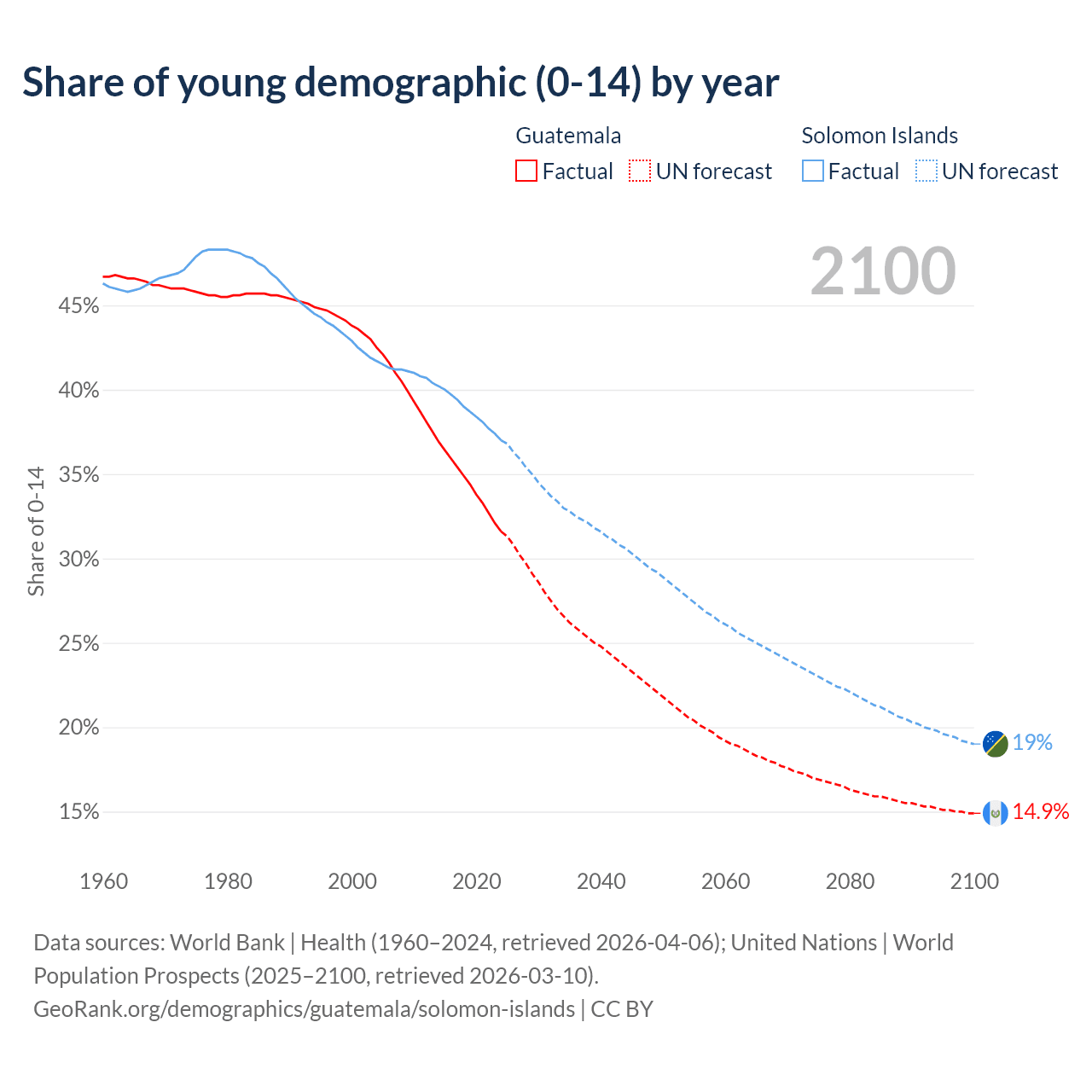 - As of 2026, the population of Guatemala is 19M vs 864K in the Solomon Islands - 22 times difference.