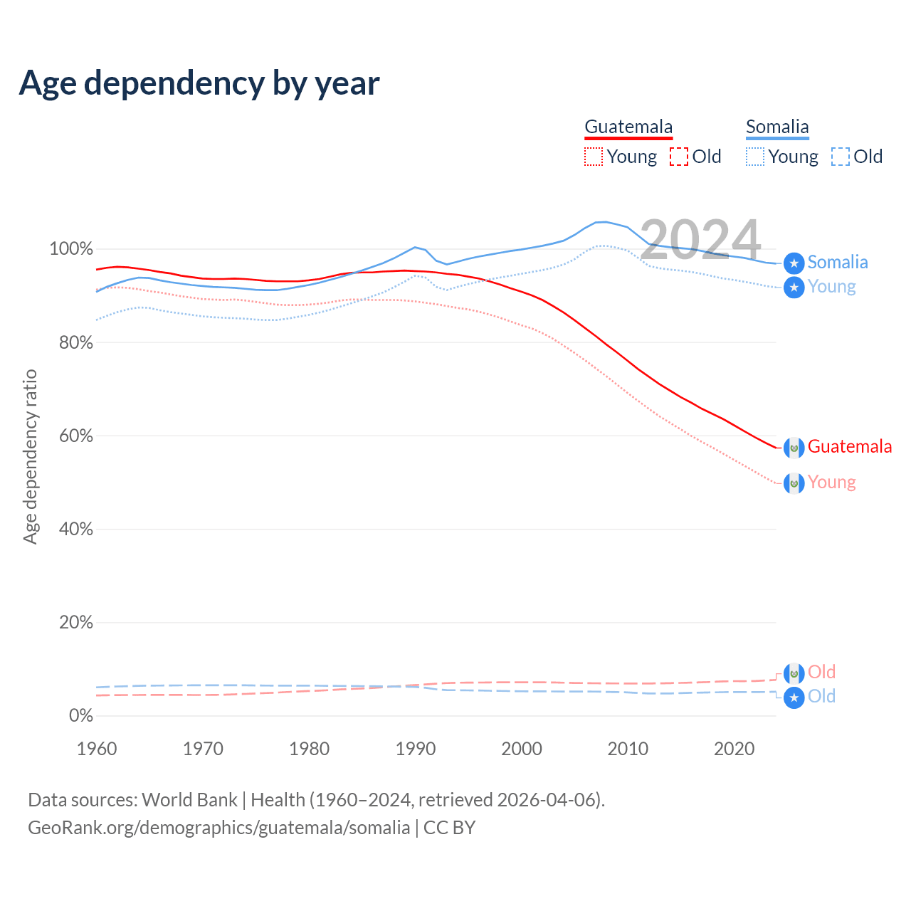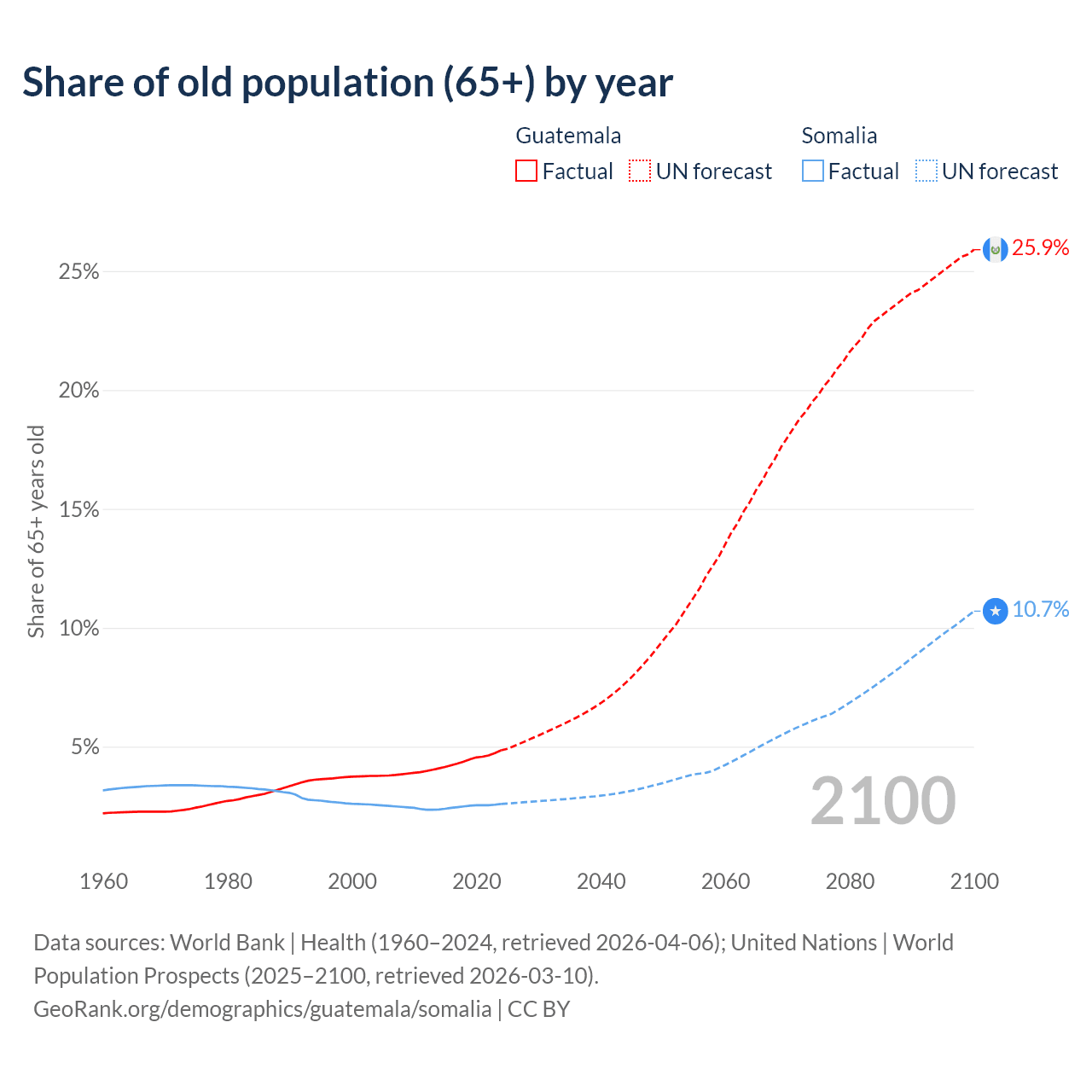 - The share of old-age demographic (65+) in Guatemala is 4.85% vs 2.59% in Somalia.