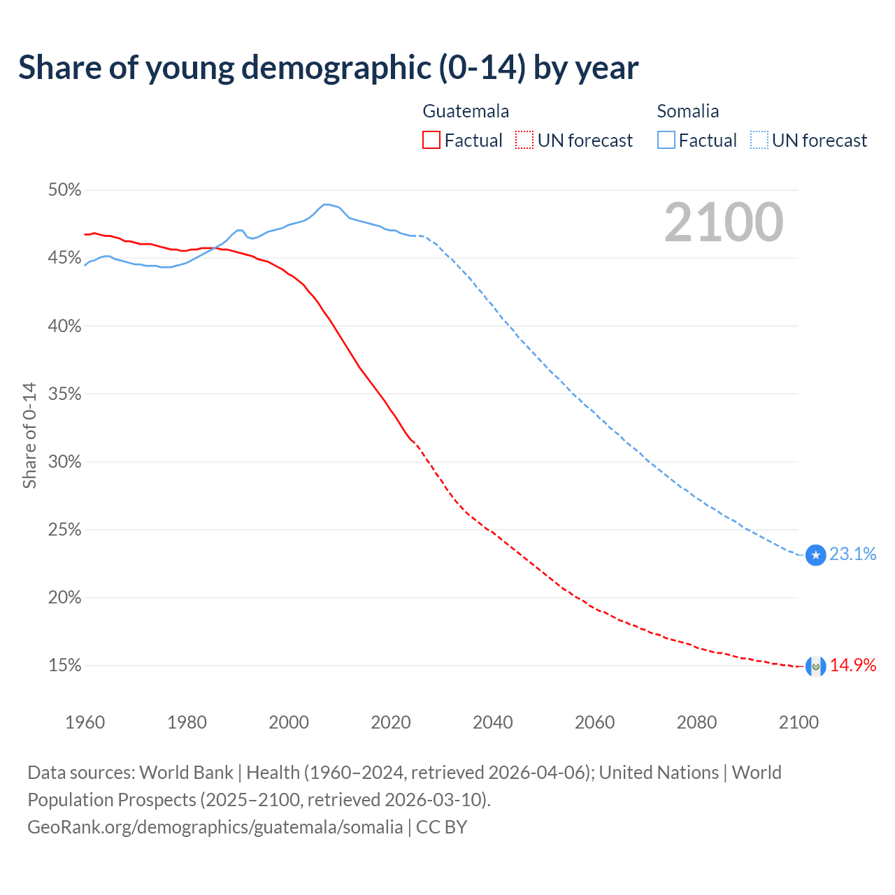 - The share of young demographic (0-15 years old) in Guatemala is 31.6% vs 46.6% in Somalia.