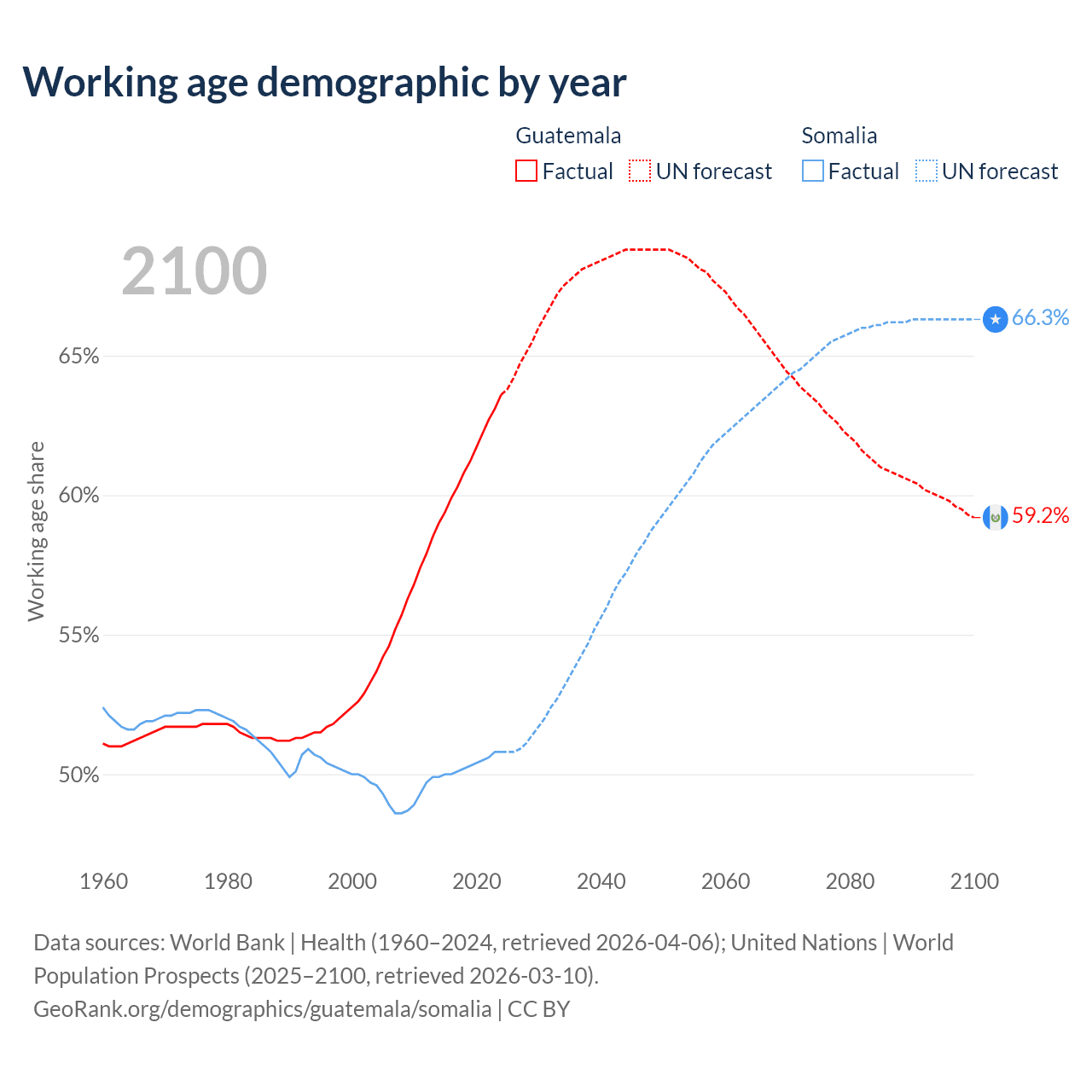 - Guatemala has 12.1M working age adults (aged 15-64) vs 10.4M in Somalia.