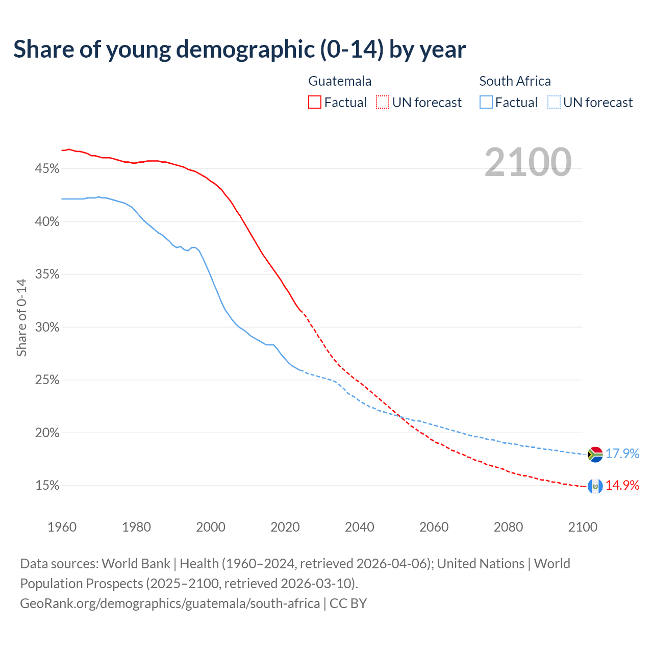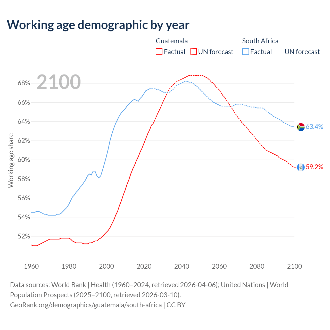 Median age Guatemala vs South Africa, 1960-2100