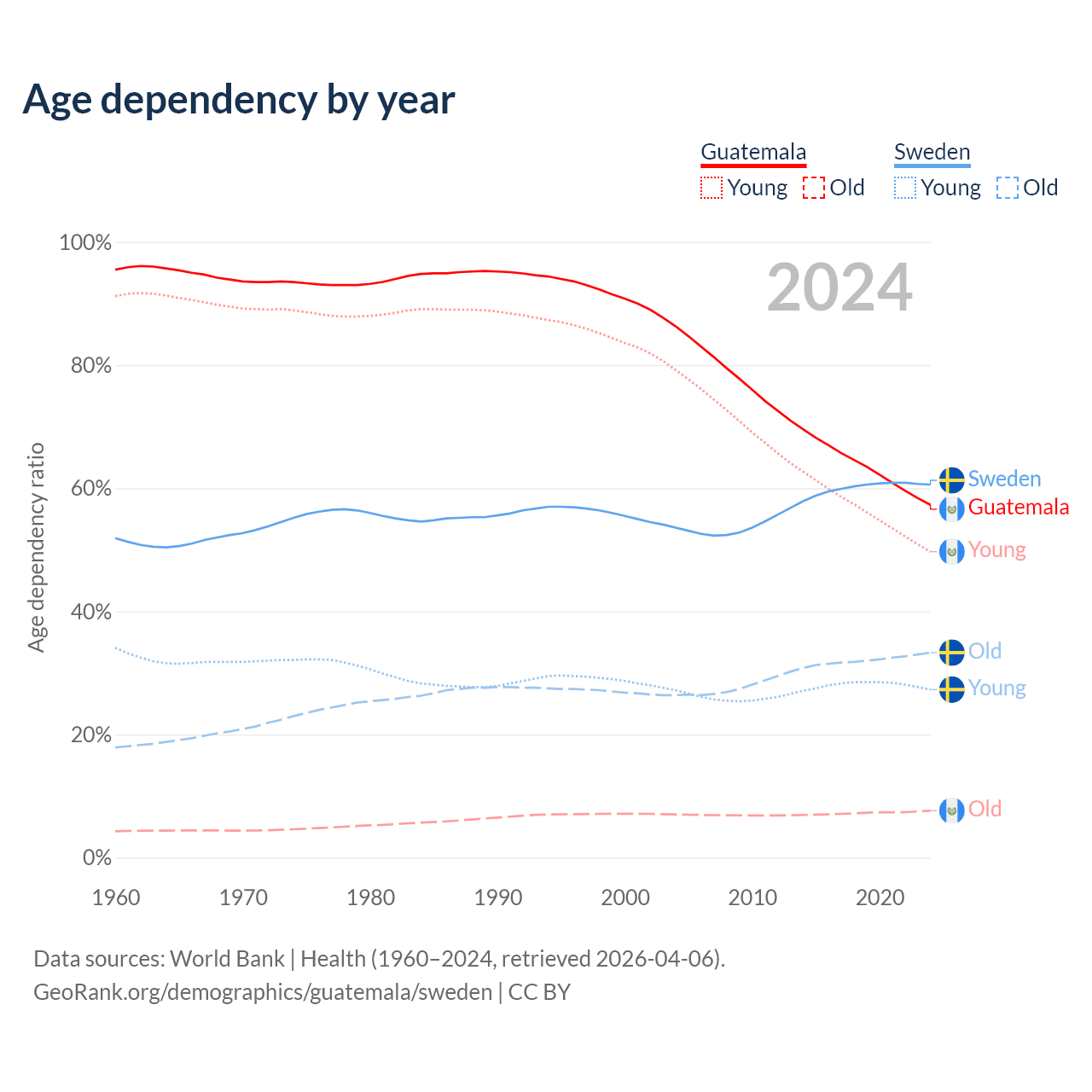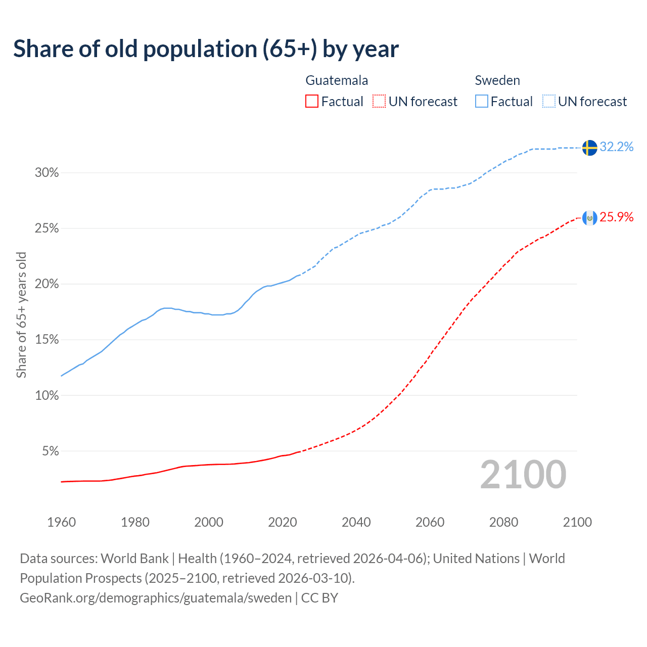- The share of old-age demographic (65+) in Guatemala is 4.85% vs 20.7% in Sweden.
