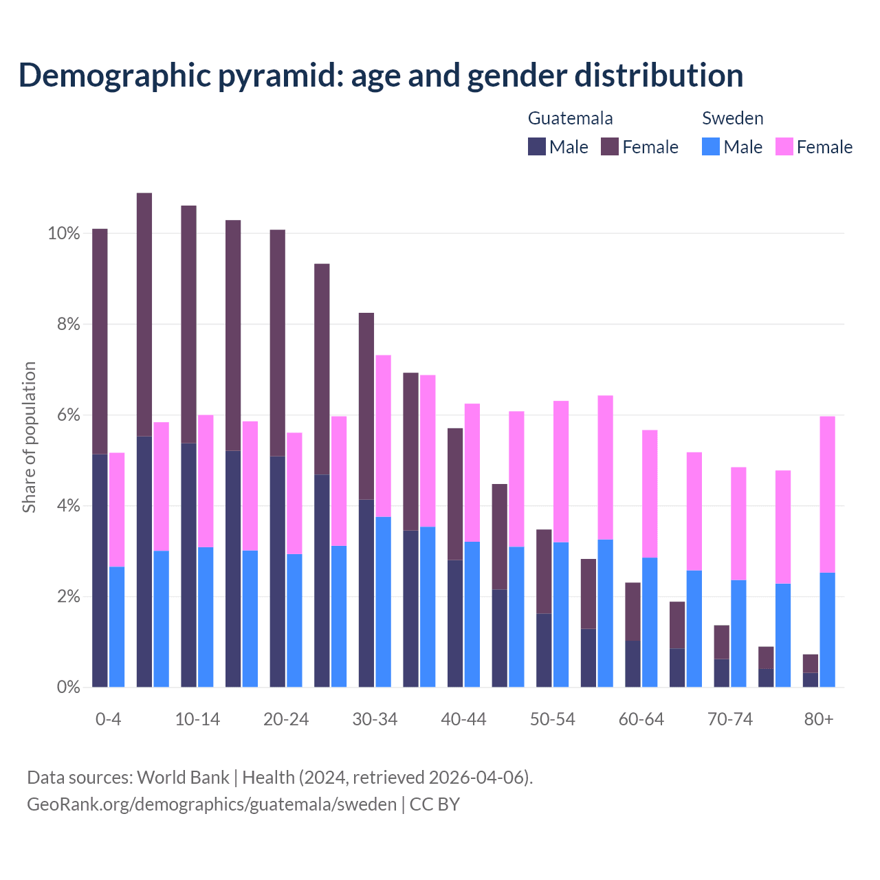 - Guatemala is ranked 137/196 by median age (oldest to youngest) vs 39/196 for Sweden.