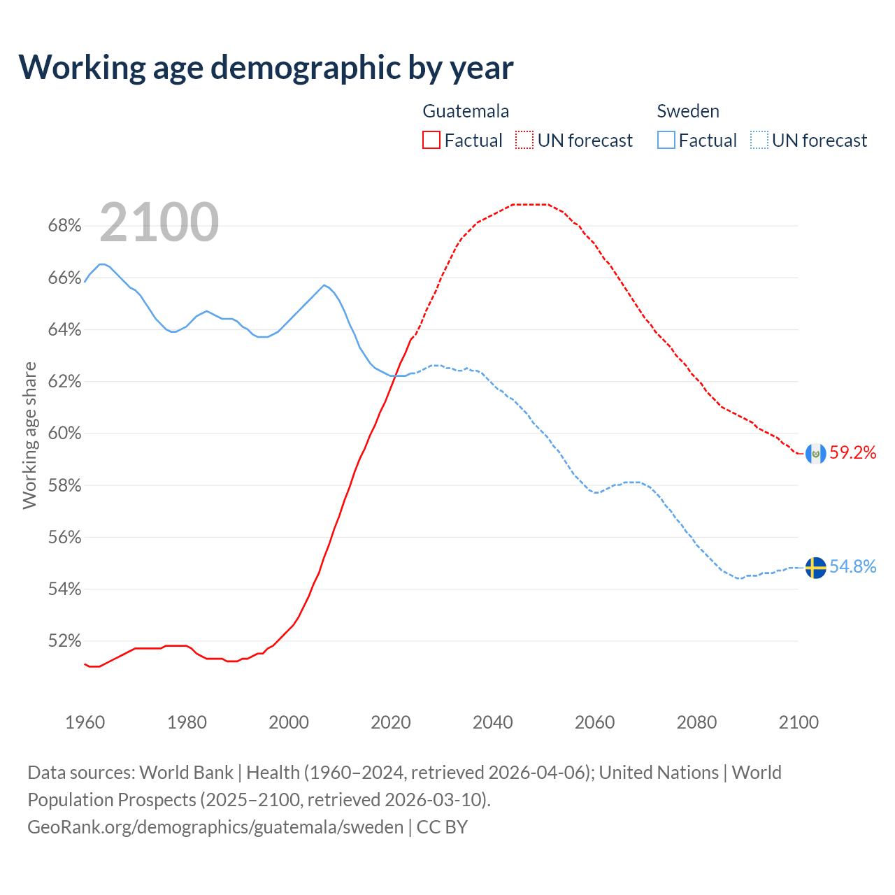 - Guatemala has 12.1M working age adults (aged 15-64) vs 6.65M in Sweden.