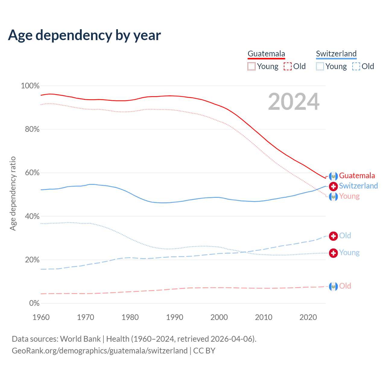 - The median age in Guatemala is 24 years compared to 43.7 years in Switzerland.