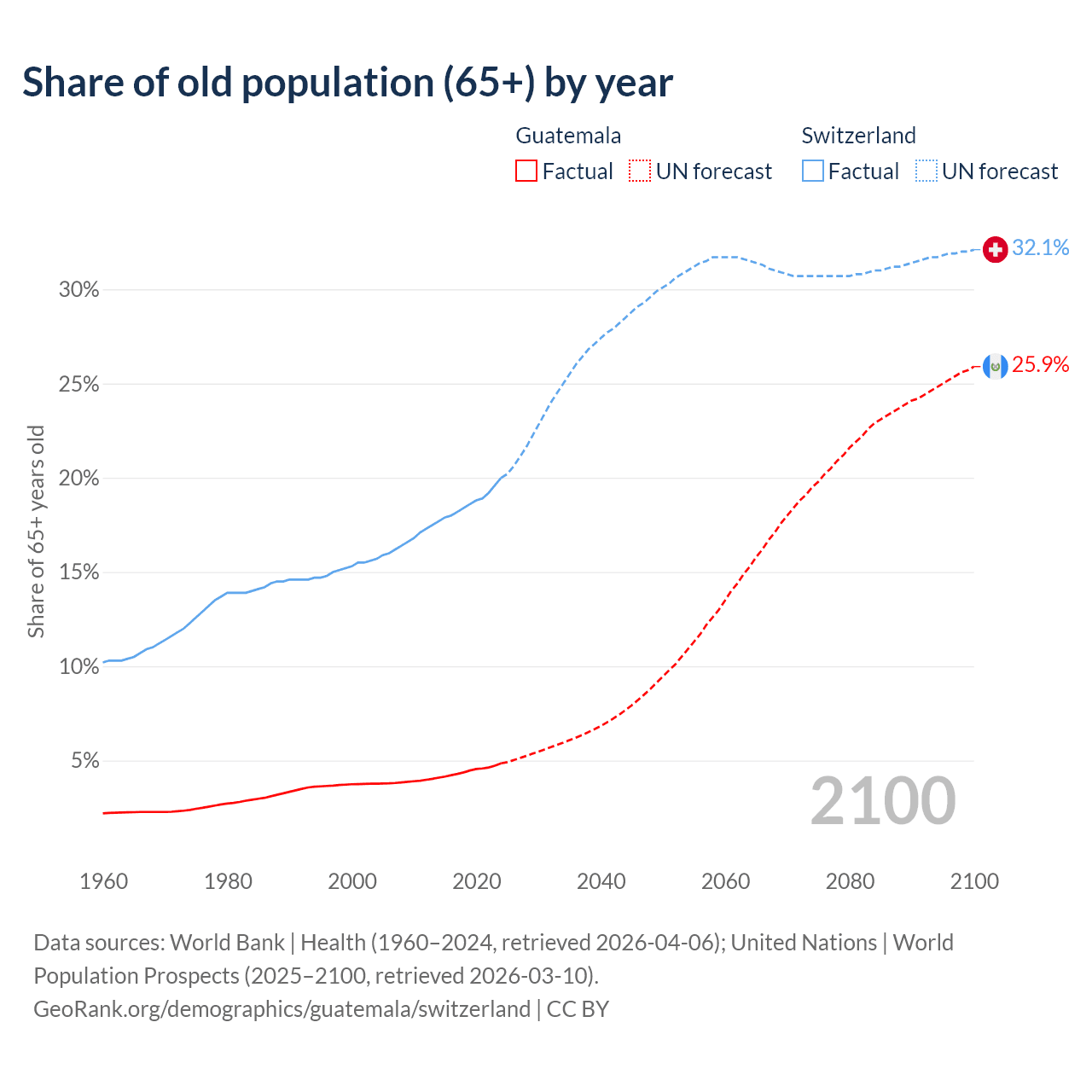 The share of older people aged 65 and over is 4.85% in Guatemala and 20% in Switzerland. Life expectancy in Guatemala compared to Switzerland .