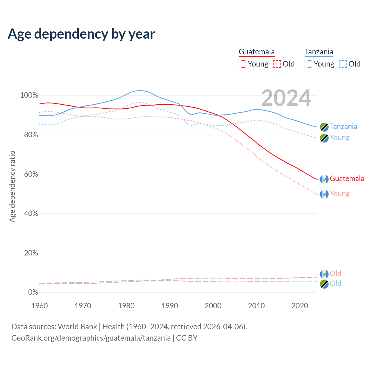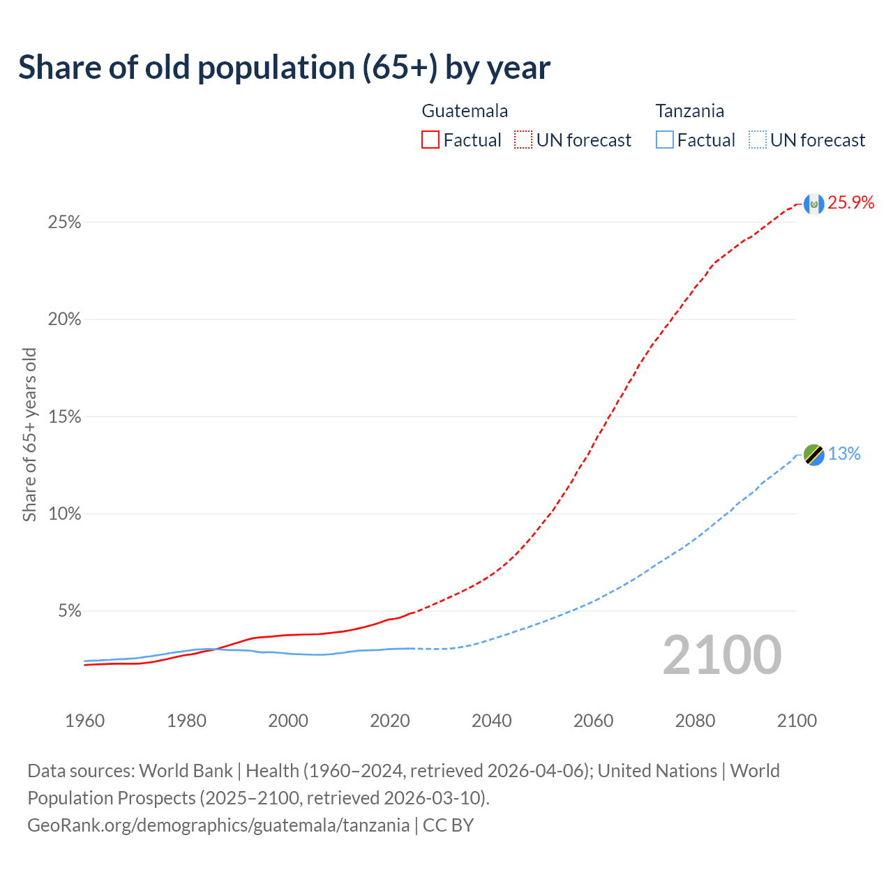 - The share of old-age demographic (65+) in Guatemala is 4.85% vs 3.05% in Tanzania.