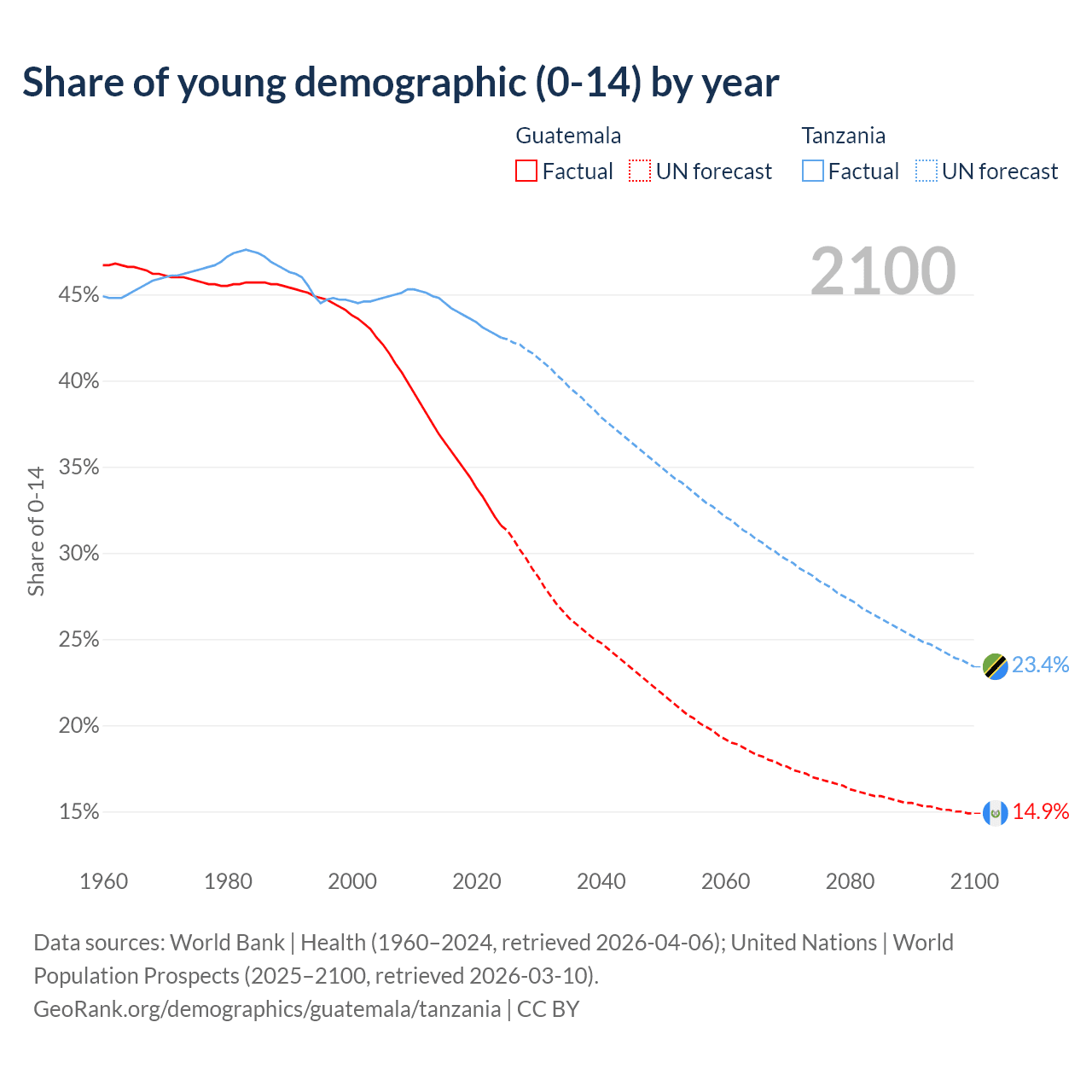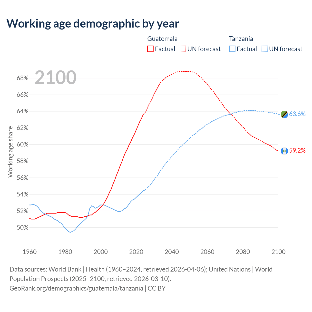 Median age Guatemala vs Tanzania, 1960-2100